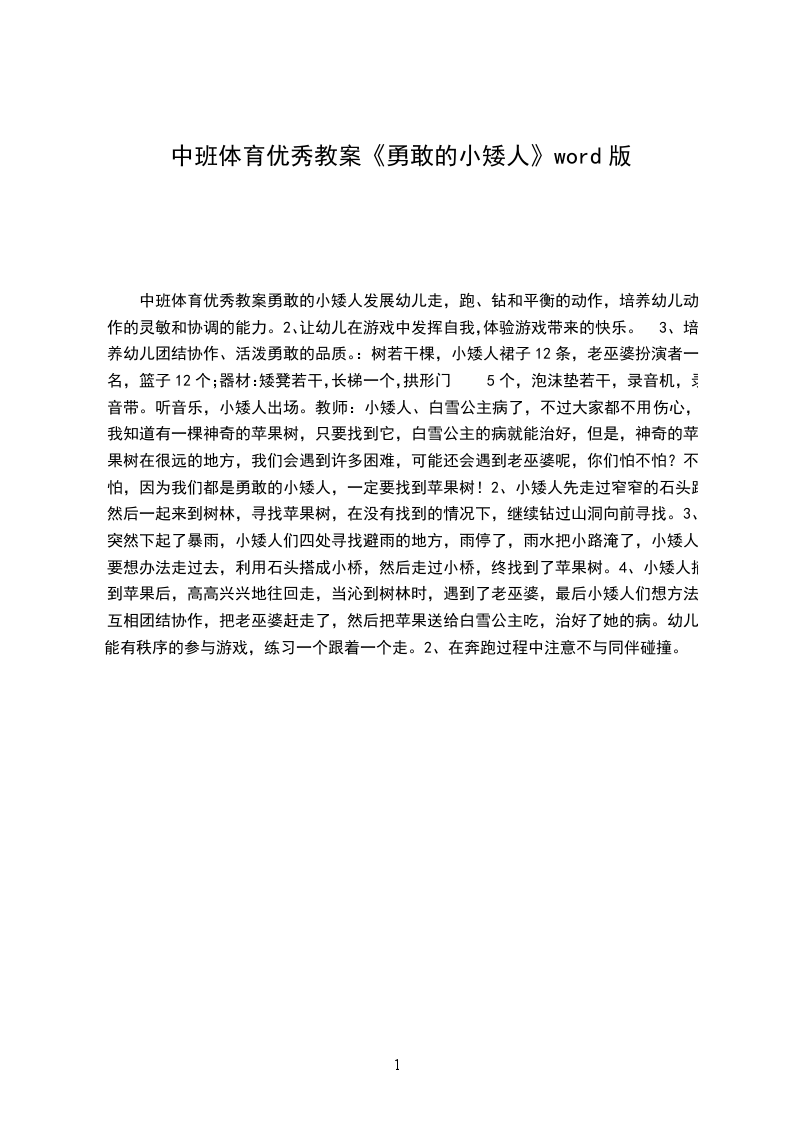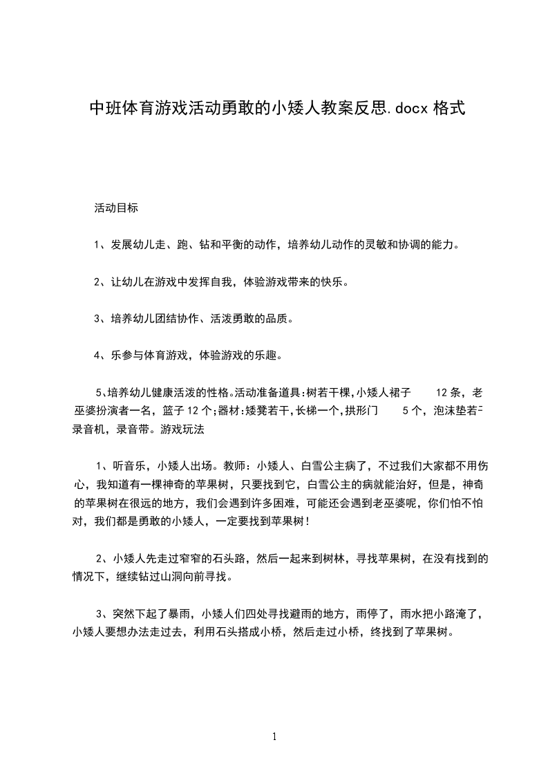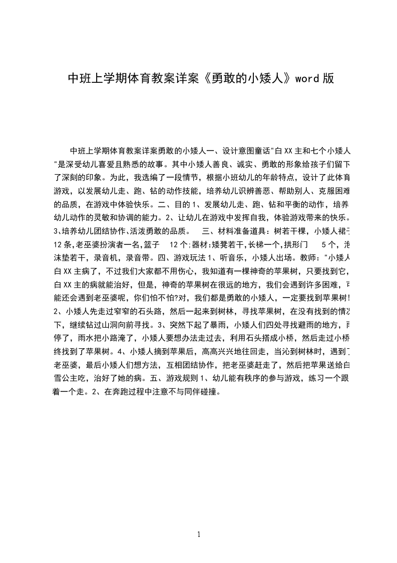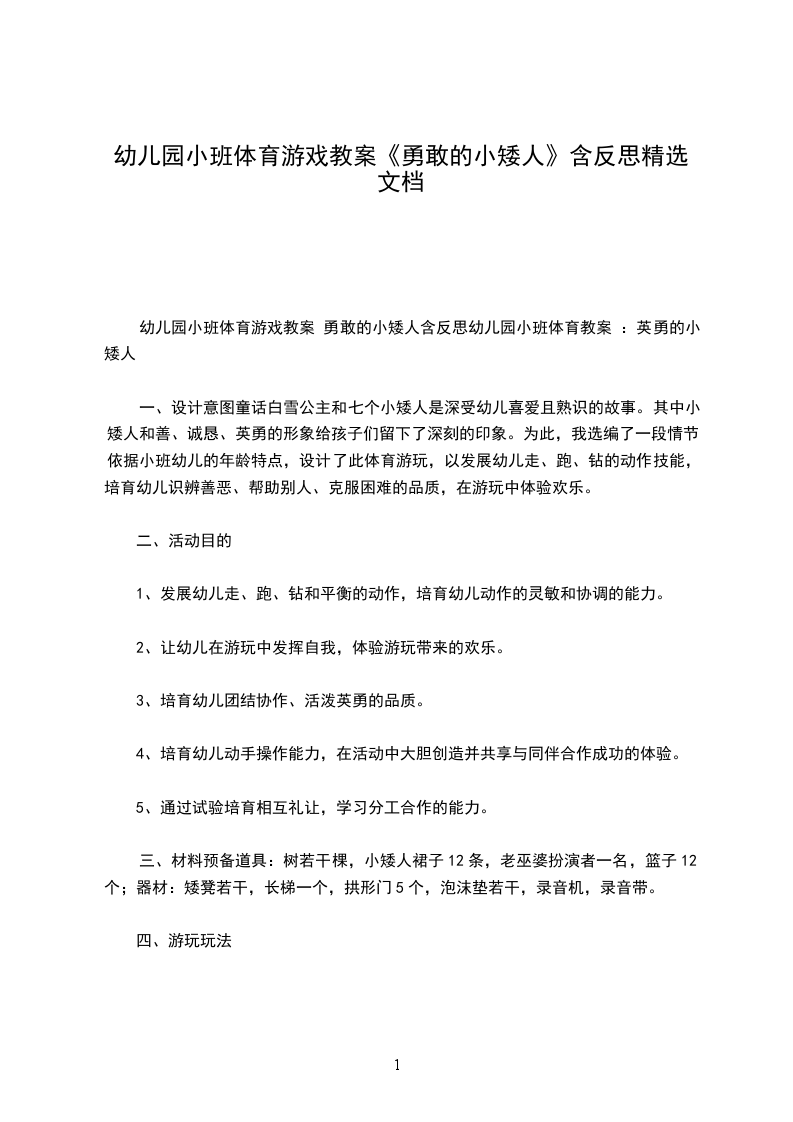 中班体育游戏详案教案及教学反思勇敢的小矮人设计意图童话"白X公主和七个小矮人"是深受幼儿喜爱且熟悉的故事。其中小矮人善良、诚实、勇敢的形象给孩子们留下了深刻的印象。为此,我选编了一段情节,根据小班幼儿的年龄特点,设计了此体育游戏,以发展幼儿走、跑、钻的动作技能,培养幼儿识辨善恶、帮助别人、克服困难的品质,在游戏中体验快乐。活动目标