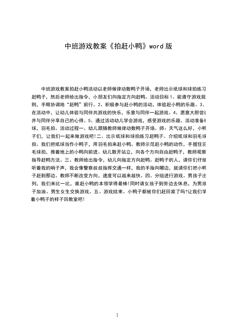 中班游戏教案拍赶小鸭活动以老师做律动数鸭子开场,老师出示纸球和球拍练习赶鸭子,然后老师给出指令,小朋友们向指定方向赶鸭。活动目标