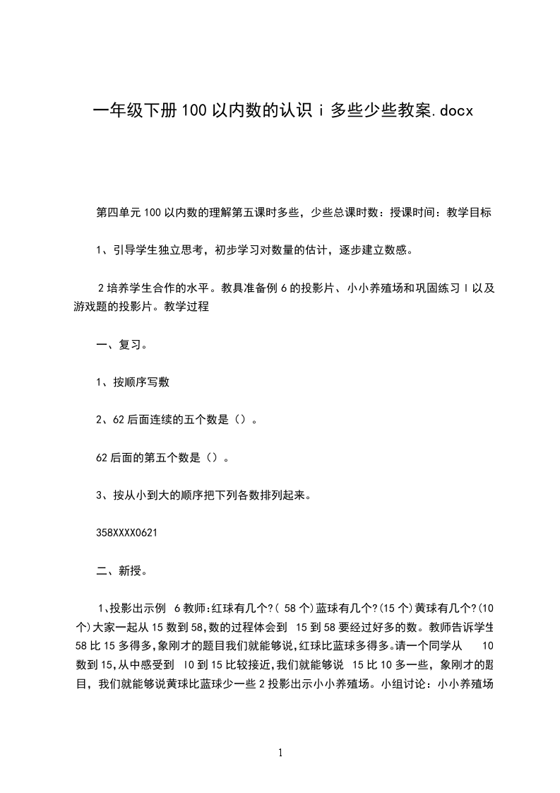 第四单元100以内数的理解第五课时多些,少些总课时数:授课时间:教学目标