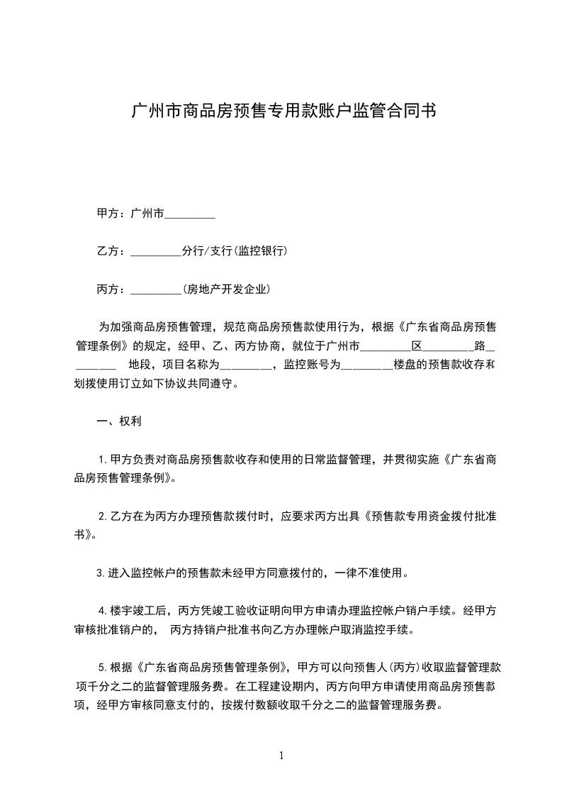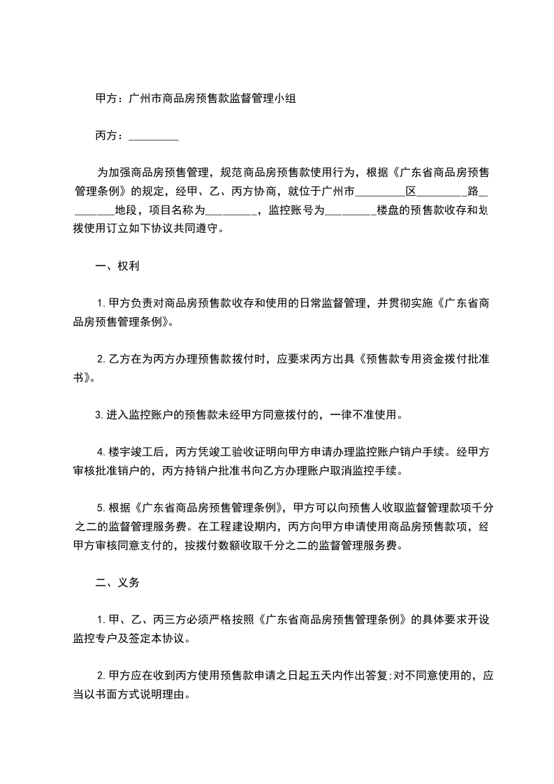为加强商品房预售管理,规范商品房预售款使用行为,根据《广东省商品房预售管理条例》的规定,经甲、乙、丙方协商,就位于广州市_________区_________路_________地段,项目名称为_________,监控账号为_________楼盘的预售款收存和划拨使用订立如下协议共同遵守。