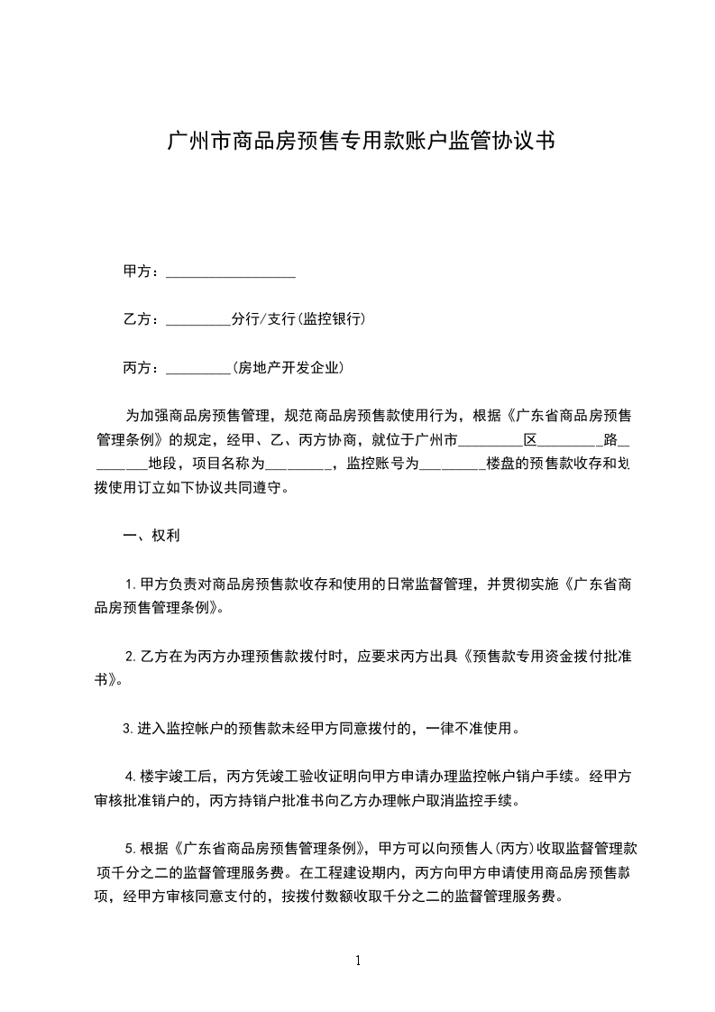 1.甲、乙、丙三方必须严格按照《广东省商品房预售管理条例》的具体要求开设监控专户及签定本协议。