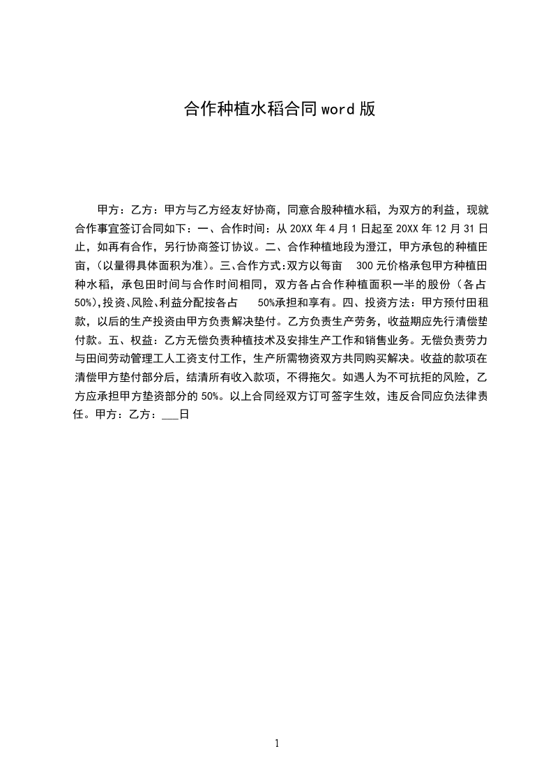 甲方:乙方:甲方与乙方经友好协商,同意合股种植水稻,为双方的利益,现就合作事宜签订合同如下: