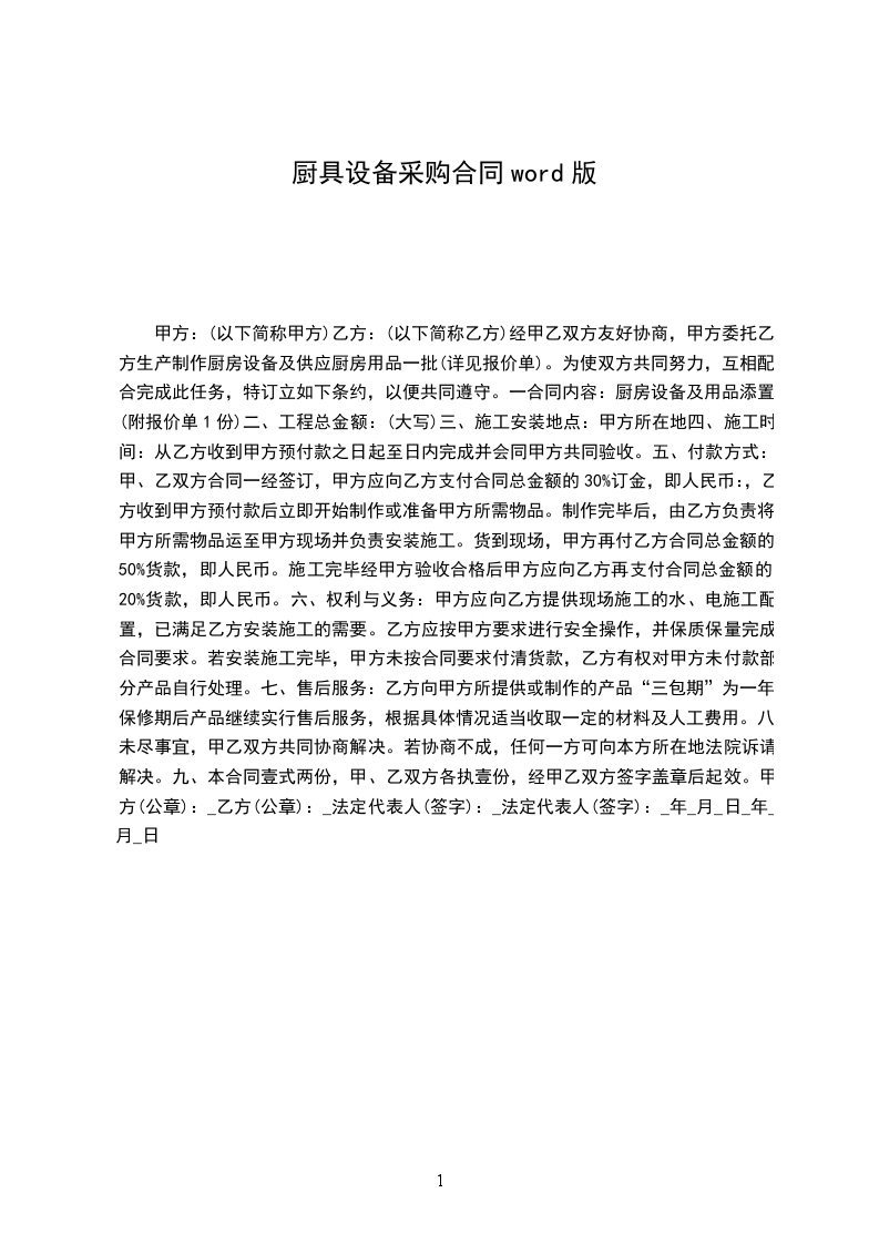 甲方:(以下简称甲方)乙方:(以下简称乙方)经甲乙双方友好协商,甲方委托乙方生产制作厨房设备及供应厨房用品一批(详见报价单)。为使双方共同努力,互相配合完成此任务,特订立如下条约,以便共同遵守。一合同内容:厨房设备及用品添置(附报价单1份)