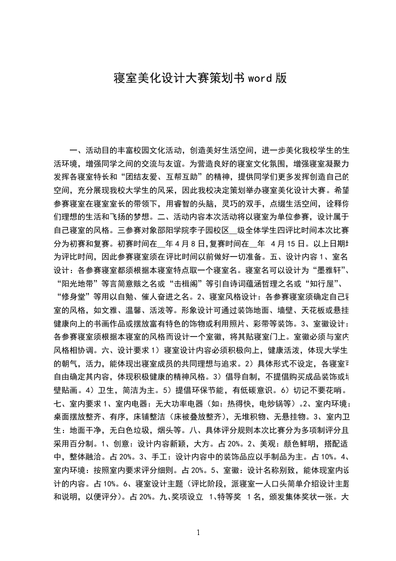二、活动内容本次活动将以寝室为单位参赛,设计属于自己寝室的风格。三参赛对象邵阳学院李子园校区__级全体学生四评比时间本次比赛分为初赛和复赛。初赛时间在__年4月8日,复赛时间在__年4月15日。以上日期均为评比时间,因此参赛寝室须在评比时间以前做好一切准备。