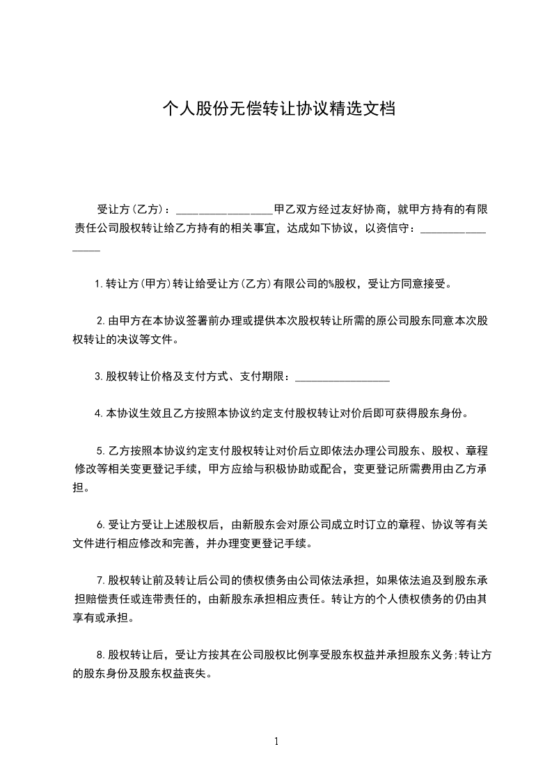 1.转让方(甲方)转让给受让方(乙方)有限公司的%股权,受让方同意接受。