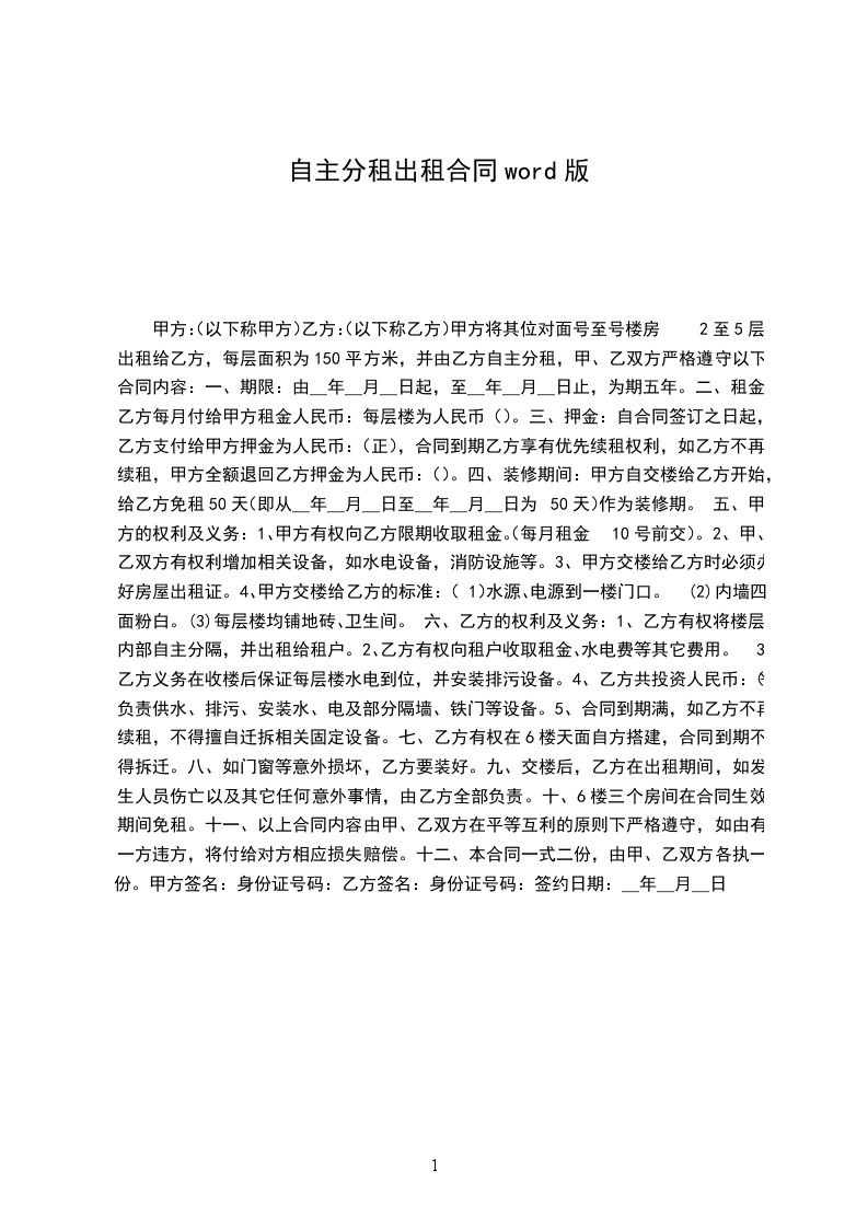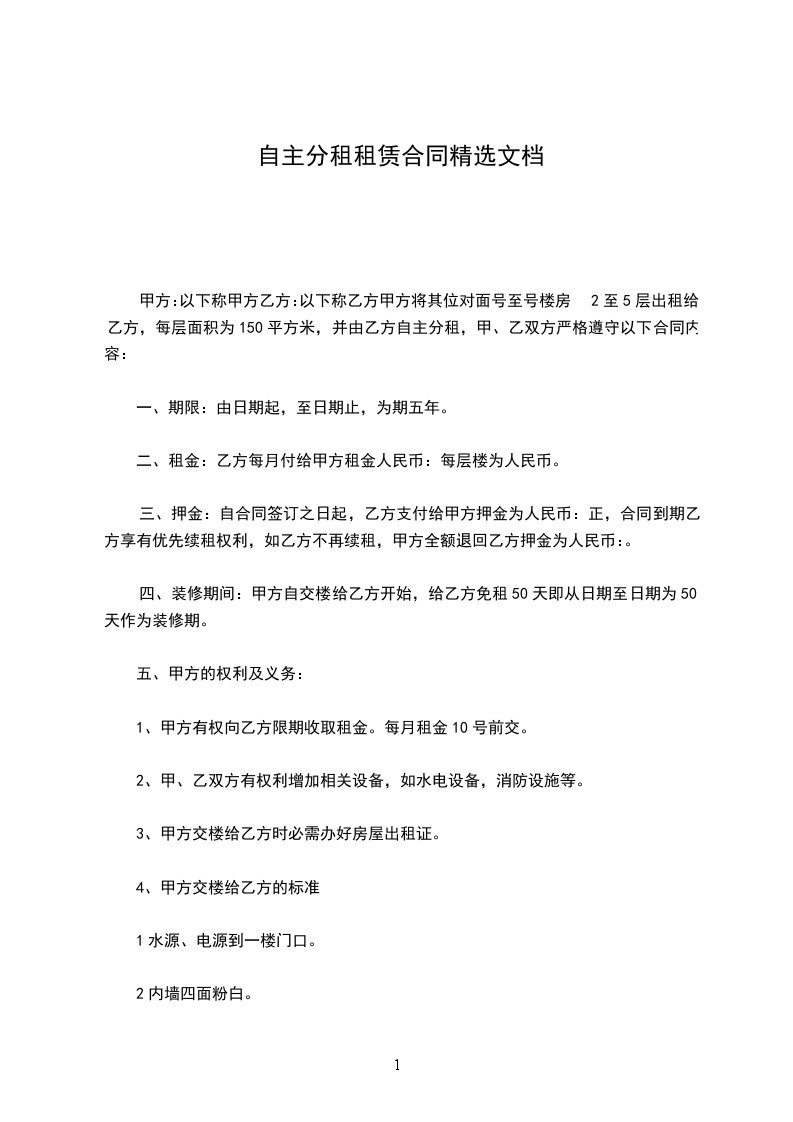 甲方:(以下称甲方)乙方:(以下称乙方)甲方将其位对面号至号楼房2至5层出租给乙方,每层面积为150平方米,并由乙方自主分租,甲、乙双方严格遵守以下合同内容: