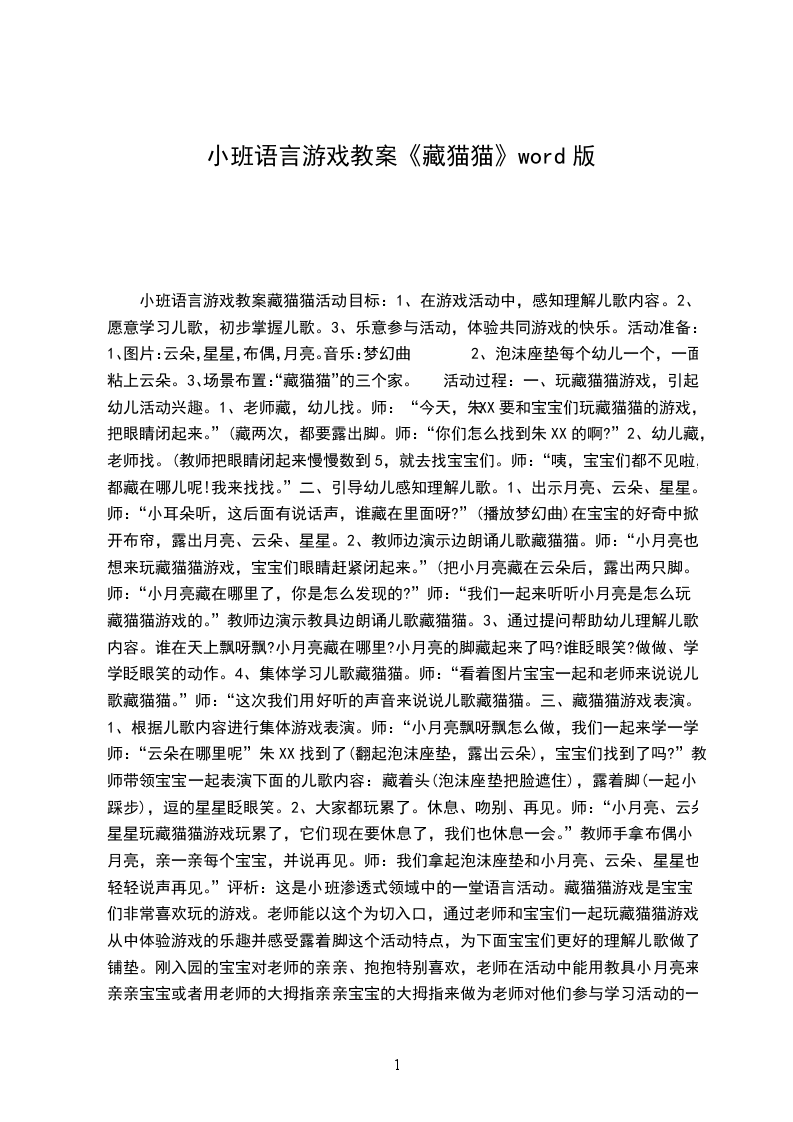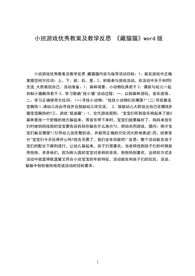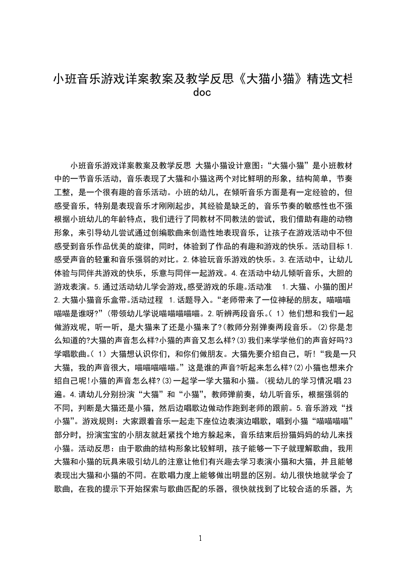 小班音乐游戏详案教案及教学反思 大猫小猫设计意图:“大猫小猫”是小班教材中的一节音乐活动,音乐表现了大猫和小猫这两个对比鲜明的形象,结构简单,节奏工整,是一个很有趣的音乐活动。小班的幼儿,在倾听音乐方面是有一定经验的,但感受音乐,特别是表现音乐才刚刚起步,其经验是缺乏的,音乐节奏的敏感性也不强,根据小班幼儿的年齡特点,我们进行了同教材不同教法的尝试,我们借助有趣的动物形象,来引导幼儿尝试通过创编歌曲来创造性地表现音乐,让孩子在游戏活动中不但感受到音乐作品优美的旋律,同时,体验到了作品的有趣和游戏的快乐。活动目标