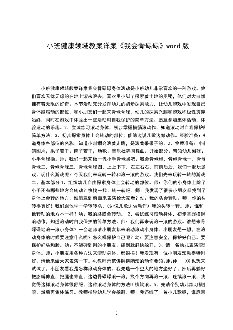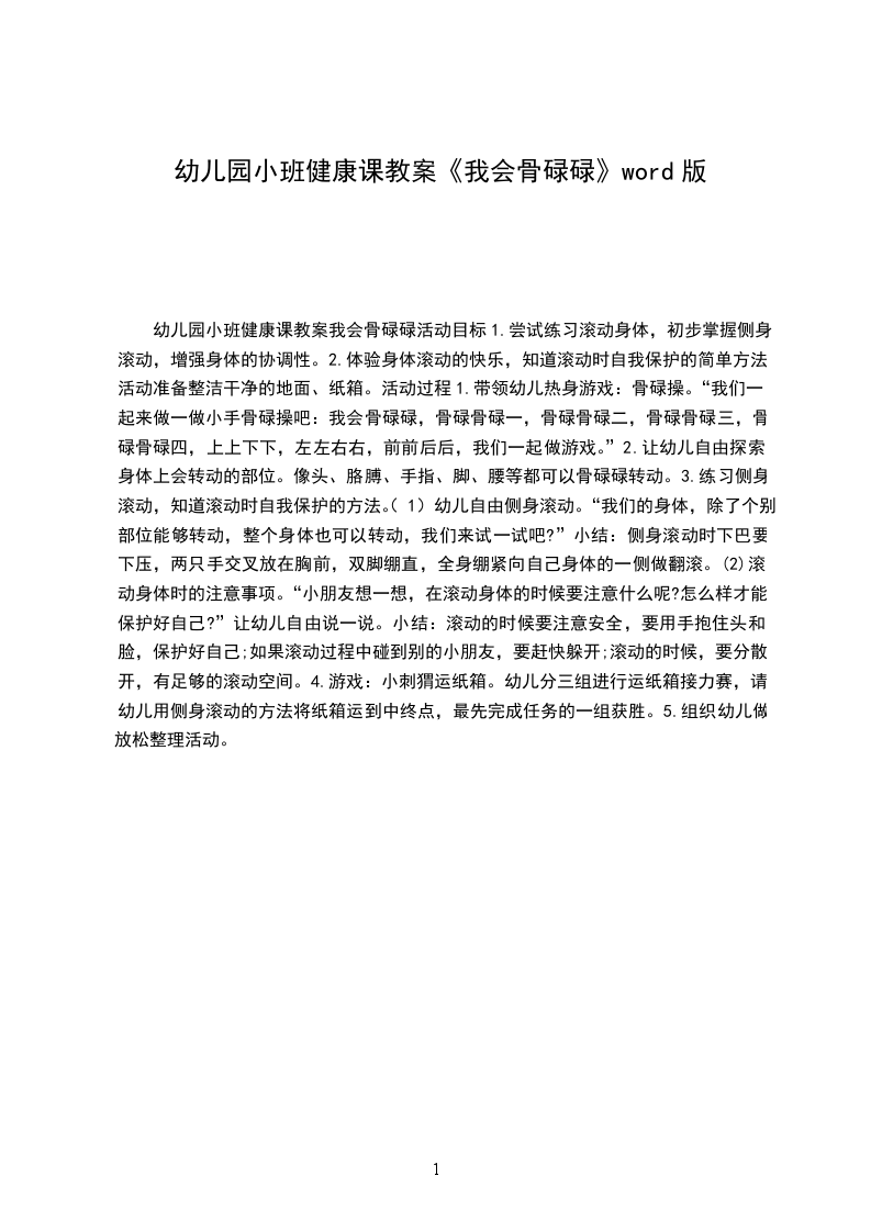 2、边说儿歌边转动身体相应的部位:"我的头骨碌碌,我的小手骨碌碌,我的小脚骨碌碌."教师:小朋友们我们来做个游戏,游戏的名字叫"身体骨碌碌",当老师说,我的头儿骨碌碌的时候你们就转动头,说我的小手骨碌碌的时候你们就转动手,说我的屁股骨碌碌的时候就转动你们的小屁股,说我的膝盖骨碌碌的时候就转动膝盖,说我的小脚骨碌碌的时候就转动脚,我来看看谁最能干,小耳朵最会听,转得最漂亮。仔细听开始了"我的头儿骨碌碌,我的手儿骨碌碌,我的膝盖骨碌碌,我的小脚骨碌碌,我的屁股骨碌碌"