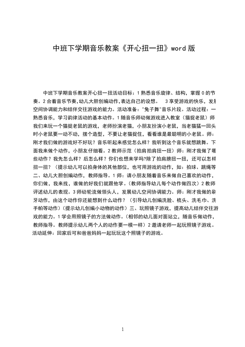 中班下学期音乐教案开心扭一扭活动目标:1熟悉音乐旋律、结构,掌握0的节奏。2合着音乐节奏,幼儿大胆创编动作,表达自己的设想。3享受游戏的快乐,发展空间协调能力和结伴交往游戏的能力。活动准备:"兔子舞"音乐片段。