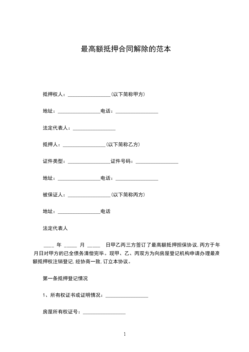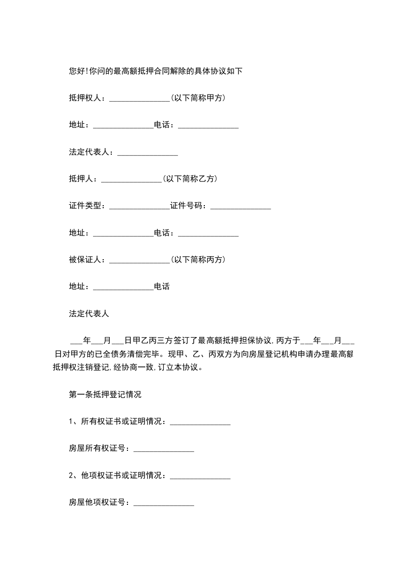 您好!你问的最高额抵押合同解除的具体协议如下