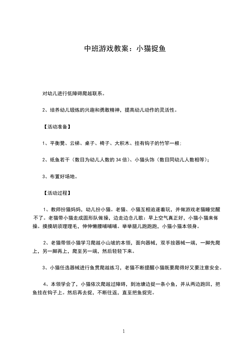 幼儿园中班体育游戏教案捉小鱼活动目标: