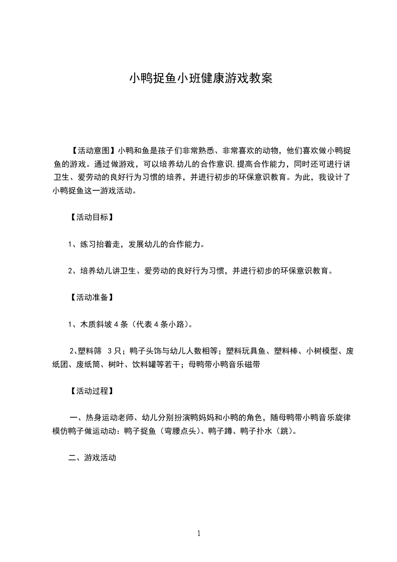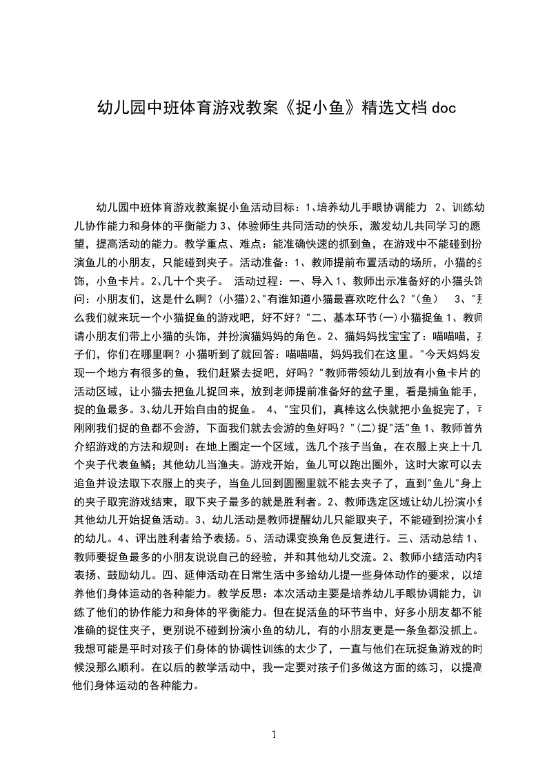 四、延伸活动在日常生活中多给幼儿提一些身体动作的要求,以培养他们身体运动的各种能力。教学反思:本次活动主要是培养幼儿手眼协调能力,训练了他们的协作能力和身体的平衡能力。但在捉活鱼的环节当中,好多小朋友都不能准确的捉住夹子,更别说不碰到扮演小鱼的幼儿,有的小朋友更是一条鱼都没抓上。我想可能是平时对孩子们身体的协调性训练的太少了,一直与他们在玩捉鱼游戏的时候没那么顺利。在以后的教学活动中,我一定要对孩子们多做这方面的练习,以提高他们身体运动的各种能力。