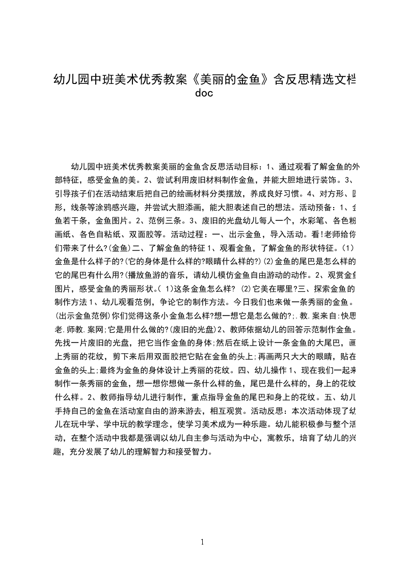1、幼儿观看范例,争论它的制作方法。今日我们也来做一条秀丽的金鱼。(出示金鱼范例)你们觉得这条小金鱼怎么样?想一想它是怎么做的?;.教.案来自:快思老.师教.案网;它是用什么做的?(废旧的光盘)