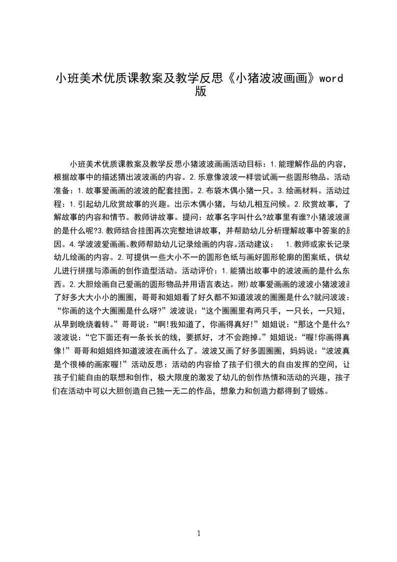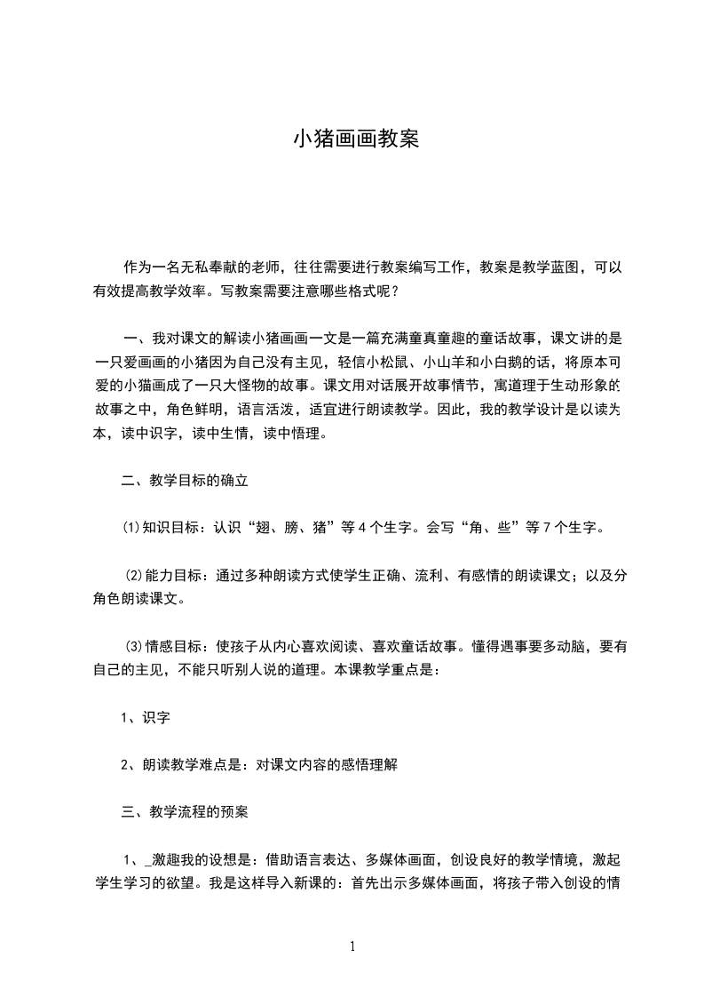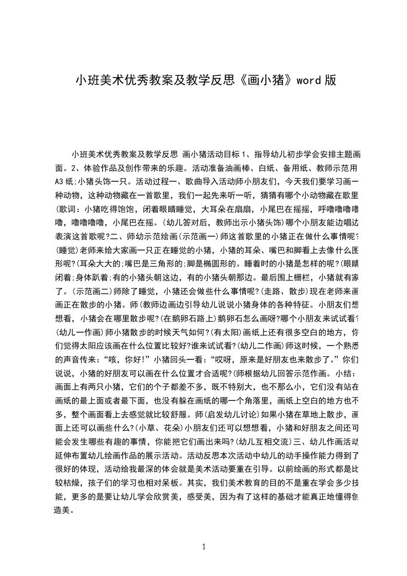 二、师幼示范绘画(示范画一)师这首歌里的小猪正在做什么事情呢?(睡觉)老师来给大家画一只正在睡觉的小猪,小猪的耳朵、嘴巴和脚看上去像什么图形呢?(耳朵大大的;嘴巴是三角形的;脚是椭圆形的。睡着时的小猪是怎样的呢?(眼睛闭着;身体趴着;有的小猪头朝这边,有的小猪头朝那边。最后围上栅栏,小猪就有家了。(示范画二)师除了睡觉,小猪还会做些什么事情呢?(走路、散步)现在老师来画画正在散步的小猪。师(教师边画边引导幼儿说说小猪身体的各种特征。小朋友们想想看,小猪会在哪里散步呢?(在鹅卵石路上)鹅卵石怎么画呀?哪个小朋友来试试看?(幼儿一作画)师小猪散步的时候天气如何?(有太阳)画纸上还有很多空白的地方,你们觉得太阳应该画在什么位置比较好?谁来试试看?(幼儿二作画)师这时候,一个熟悉的声音传来:“咳,你好!”小猪回头一看:“哎呀,原来是好朋友也来散步了。”你们说说,小猪的好朋友可以画在什么位置才合适呢?(师根据幼儿回答示范作画。小结:画面上有两只小猪,它们的个子都差不多,既不特别大,也不那么小,它们没有站在画纸的最上面或者最下面,也没有躲在画纸的哪一个角落里,画纸上空白的地方也不多,整个画面看上去感觉就比较舒服。师(启发幼儿讨论)如果小猪在草地上散步,画面上还可以画些什么?(小草、花朵)小朋友们还可以想想看,小猪和好朋友之间还可能会发生哪些有趣的事情,你能把它们画出来吗?(幼儿互相交流)