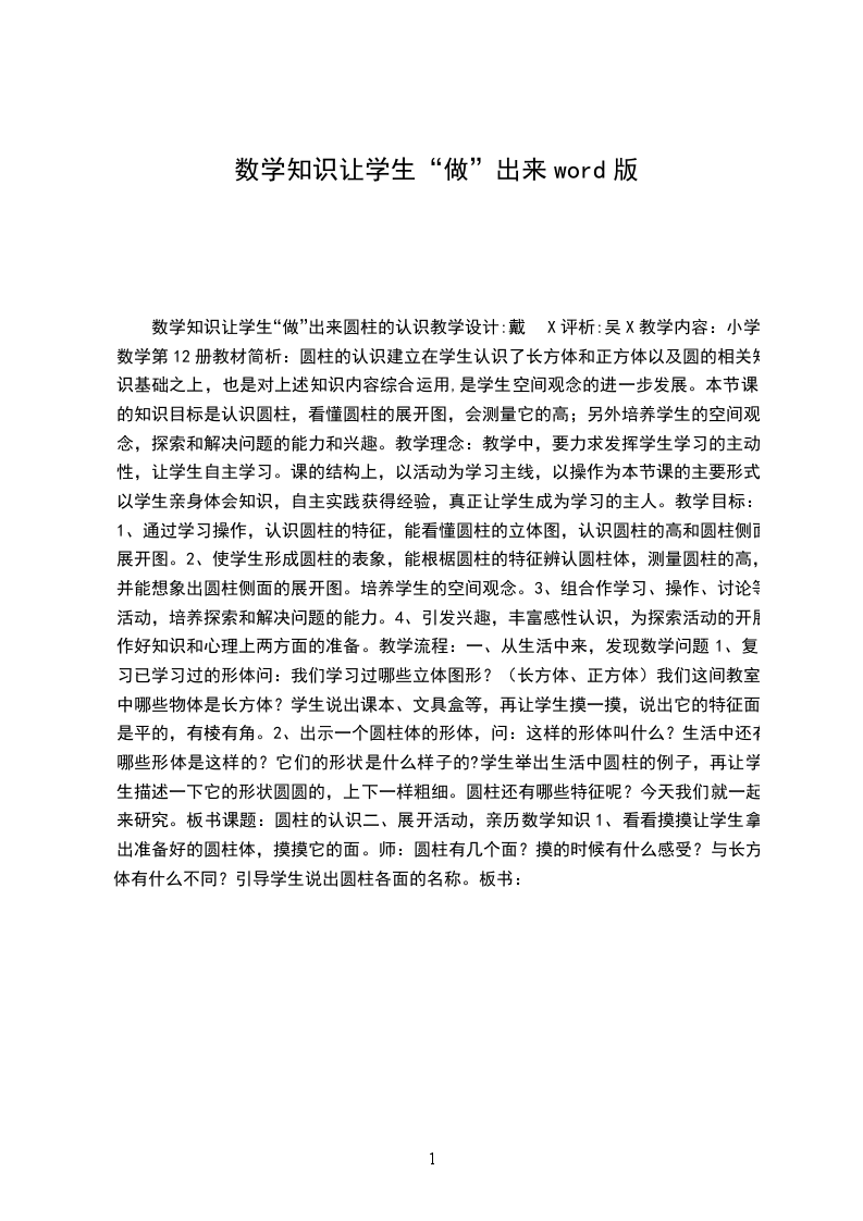 数学知识让学生“做”出来圆柱的认识教学设计:戴X评析:吴X教学内容:小学数学第12册教材简析:圆柱的认识建立在学生认识了长方体和正方体以及圆的相关知识基础之上,也是对上述知识内容综合运用,是学生空间观念的进一步发展。本节课的知识目标是认识圆柱,看懂圆柱的展开图,会测量它的高;另外培养学生的空间观念,探索和解决问题的能力和兴趣。教学理念:教学中,要力求发挥学生学习的主动性,让学生自主学习。课的结构上,以活动为学习主线,以操作为本节课的主要形式,以学生亲身体会知识,自主实践获得经验,真正让学生成为学习的主人。教学目标: