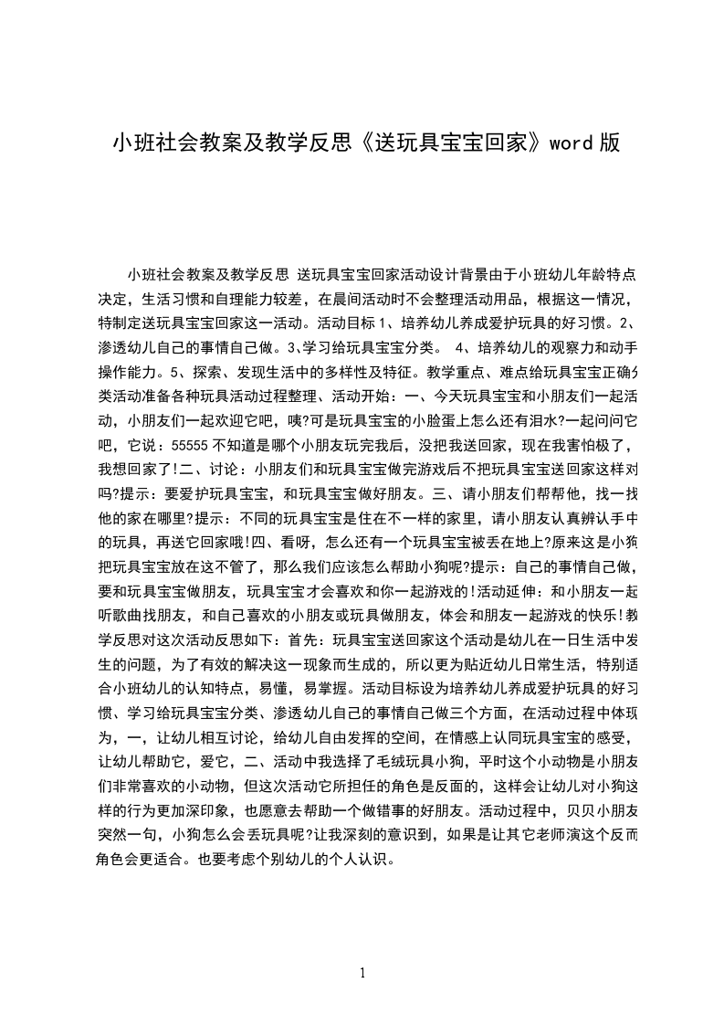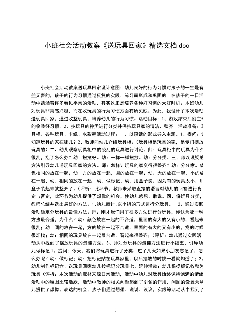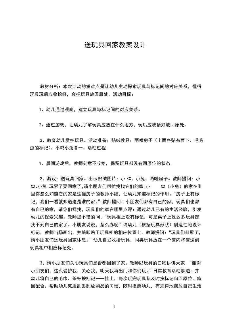 小班社会活动教案送玩具回家设计意图:幼儿良好的行为习惯对孩子的一生是有益无害的,孩子的行为习惯通过反复的实践、练习而形成和巩固的。在孩子的一日活动中蕴涵着许多看似平常的活动,其实这正是培养各种好习惯的大好时机。本班幼儿对玩具非常感兴趣,而在收玩具的行为习惯方面有所欠缺。为此,我设计了本次活动送玩具回家,通过收整玩具,培养幼儿的行为习惯。活动目标: