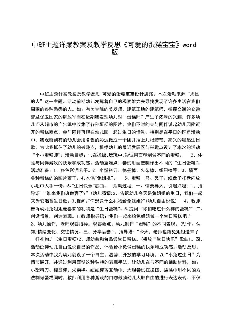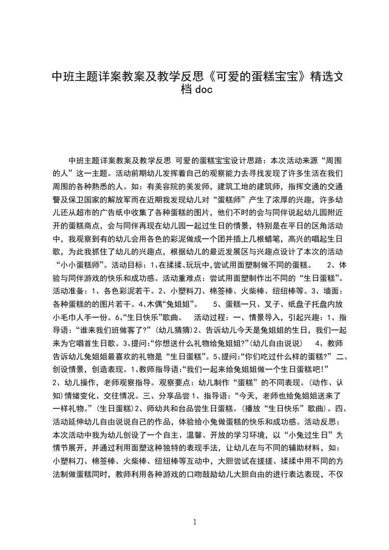 中班主题详案教案及教学反思 可爱的蛋糕宝宝设计思路:本次活动来源“周围的人”这一主题。活动前期幼儿发挥着自己的观察能力去寻找发现了许多生活在我们周围的各种熟悉的人。如:有美容院的美发师,建筑工地的建筑师,指挥交通的交通警及保卫国家的解放军而在近期我发现幼儿对“蛋糕师”产生了浓厚的兴趣,许多幼儿还从超市的广告纸中收集了各种蛋糕的图片,他们不时的会与同伴说起幼儿园附近开的蛋糕商点,会与同伴再现在幼儿园一起过生日的情景,特别是在平日的区角活动中,我观察到有的幼儿会用各色的彩泥做成一个团并插上几根蜡笔,高兴的唱起生日歌,为此我抓住了幼儿的兴趣点,根据幼儿的最近发展区与兴趣点设计了本次的活动“小小蛋糕师”。活动目标: