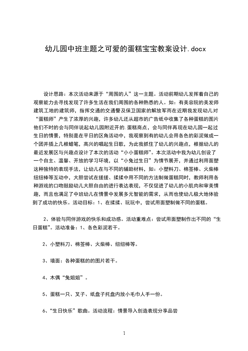 四、活动延伸幼儿自由说说自己的作品,体验给小兔做蛋糕的快乐和成功感。活动反思:本次活动中我为幼儿创设了一个自主、温馨、开放的学习环境,以“小兔过生日”为情节展开,并通过利用面塑这种独特的表现手法,让幼儿在与不同的辅助材料,如:小塑料刀、棉签棒、火柴棒、纽纽棒等互动中,大胆尝试在搓搓、揉揉中用不同的方法制做蛋糕同时,教师利用各种游戏的口吻鼓励幼儿大胆自由的进行表达表现,不仅促进了幼儿的小肌肉和审美情趣,而且也满足了中班幼儿在情景中发展多元智能的需求,从而也使幼儿极大地体验到了成功的快乐。