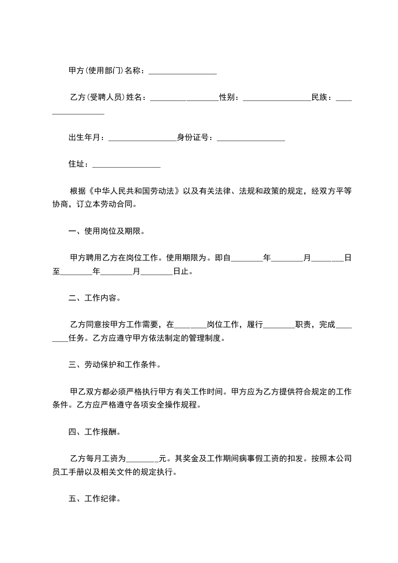 甲方聘用乙方在岗位工作。使用期限为。即自________年________月________日至________年________月________日止。