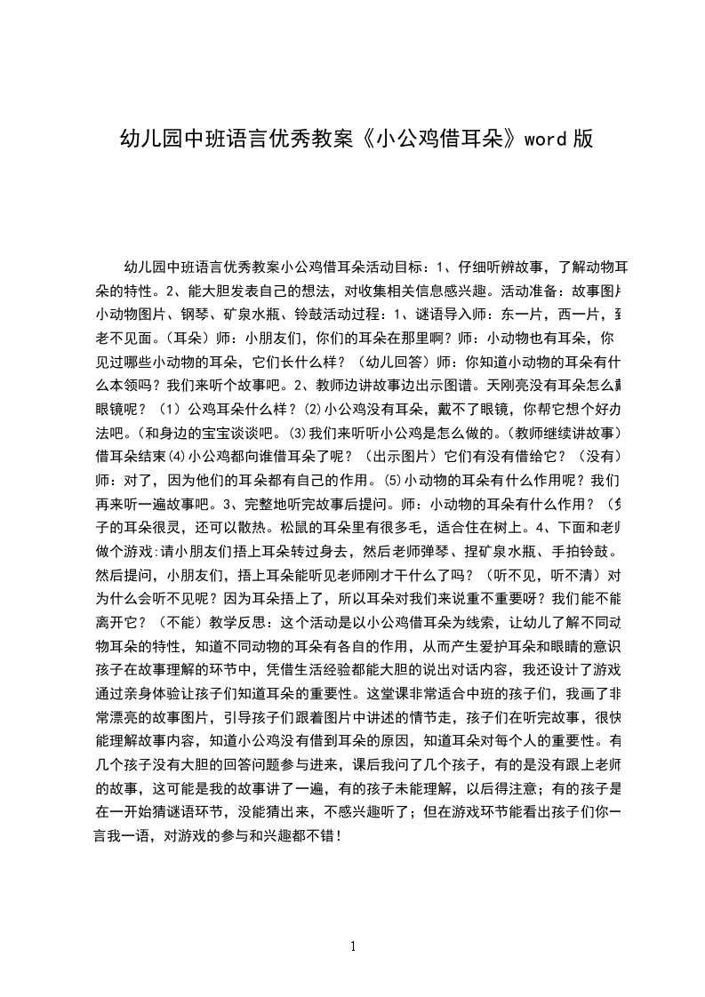 4、下面和老师做个游戏:请小朋友们捂上耳朵转过身去,然后老师弹琴、捏矿泉水瓶、手拍铃鼓。然后提问,小朋友们,捂上耳朵能听见老师刚才干什么了吗?(听不见,听不清)对,为什么会听不见呢?因为耳朵捂上了,所以耳朵对我们来说重不重要呀?我们能不能离开它?(不能)教学反思:这个活动是以小公鸡借耳朵为线索,让幼儿了解不同动物耳朵的特性,知道不同动物的耳朵有各自的作用,从而产生爱护耳朵和眼睛的意识,孩子在故事理解的环节中,凭借生活经验都能大胆的说出对话内容,我还设计了游戏,通过亲身体验让孩子们知道耳朵的重要性。这堂课非常适合中班的孩子们,我画了非常漂亮的故事图片,引导孩子们跟着图片中讲述的情节走,孩子们在听完故事,很快能理解故事内容,知道小公鸡没有借到耳朵的原因,知道耳朵对每个人的重要性。有几个孩子没有大胆的回答问题参与进来,课后我问了几个孩子,有的是没有跟上老师的故事,这可能是我的故事讲了一遍,有的孩子未能理解,以后得注意;有的孩子是在一开始猜谜语环节,没能猜出来,不感兴趣听了;但在游戏环节能看出孩子们你一言我一语,对游戏的参与和兴趣都不错!