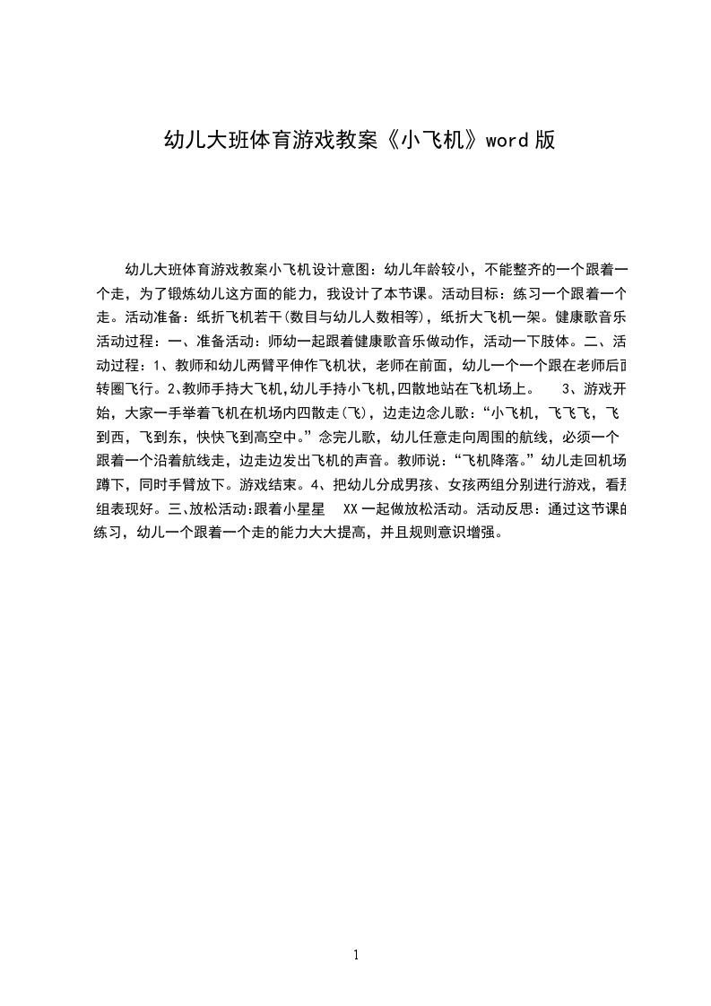 幼儿大班体育游戏教案小飞机设计意图:幼儿年龄较小,不能整齐的一个跟着一个走,为了锻炼幼儿这方面的能力,我设计了本节课。活动目标:练习一个跟着一个走。活动准备:纸折飞机若干(数目与幼儿人数相等),纸折大飞机一架。健康歌音乐。
