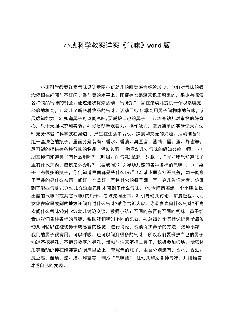 小班科学教案详案气味设计意图小班幼儿的嗅觉感官经验较少,他们对气味的概念停留在好闻与不好闻、香与臭的水平上,即便有也是潜意识里积累的,很少有探索各种物品气味的机会。通过这次探索活动“气味瓶”,旨在给幼儿提供一个积累嗅觉经验的机会,让幼儿了解各种物品的气味。活动目标