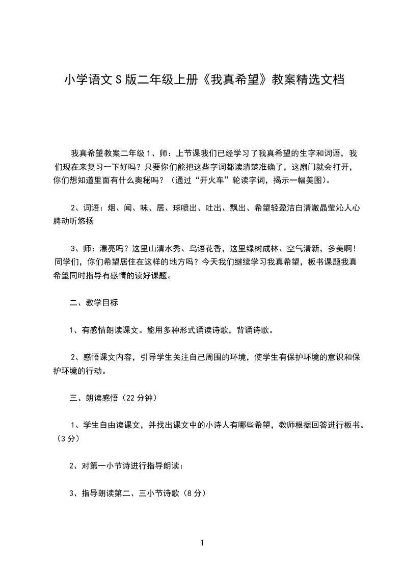 我真希望教案二年级1、师:上节课我们已经学习了我真希望的生字和词语,我们现在来复习一下好吗?只要你们能把这些字词都读清楚准确了,这扇门就会打开,你们想知道里面有什么奥秘吗?(通过“开火车”轮读字词,揭示一幅美图)。