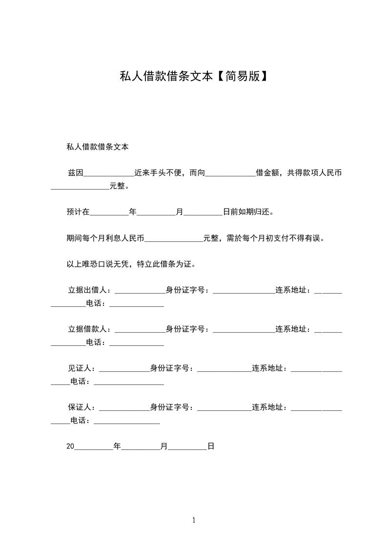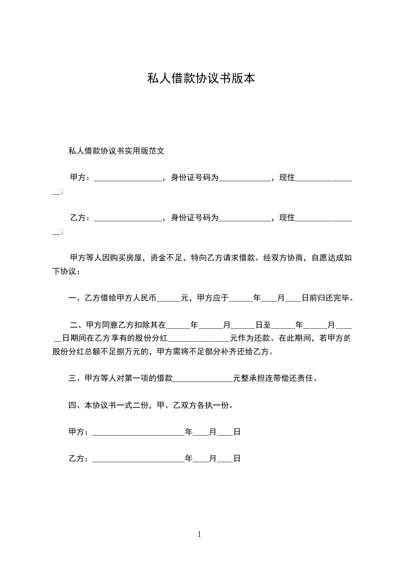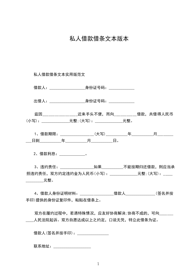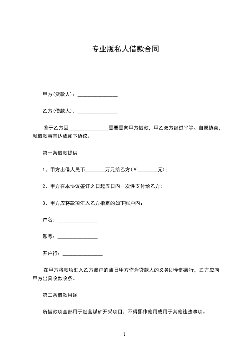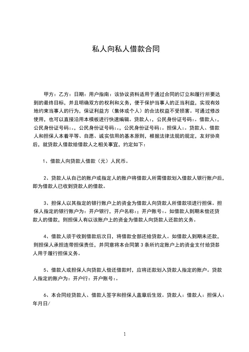 私人借款合同甲方:_乙方:_日期:_私人借款合同。甲方(借款人):身份证号码:乙方(贷款人):身份证号码:甲乙双方就借款事宜,在平等自愿、协商一致的基础上达成如下协议,以资双方共同遵守。乙方贷给甲方人民币(大写)_,_年_月_日前交付甲方。借款利息:_借款期限:还款日期:_年_月_日。还款方式:现支付。违约责任: