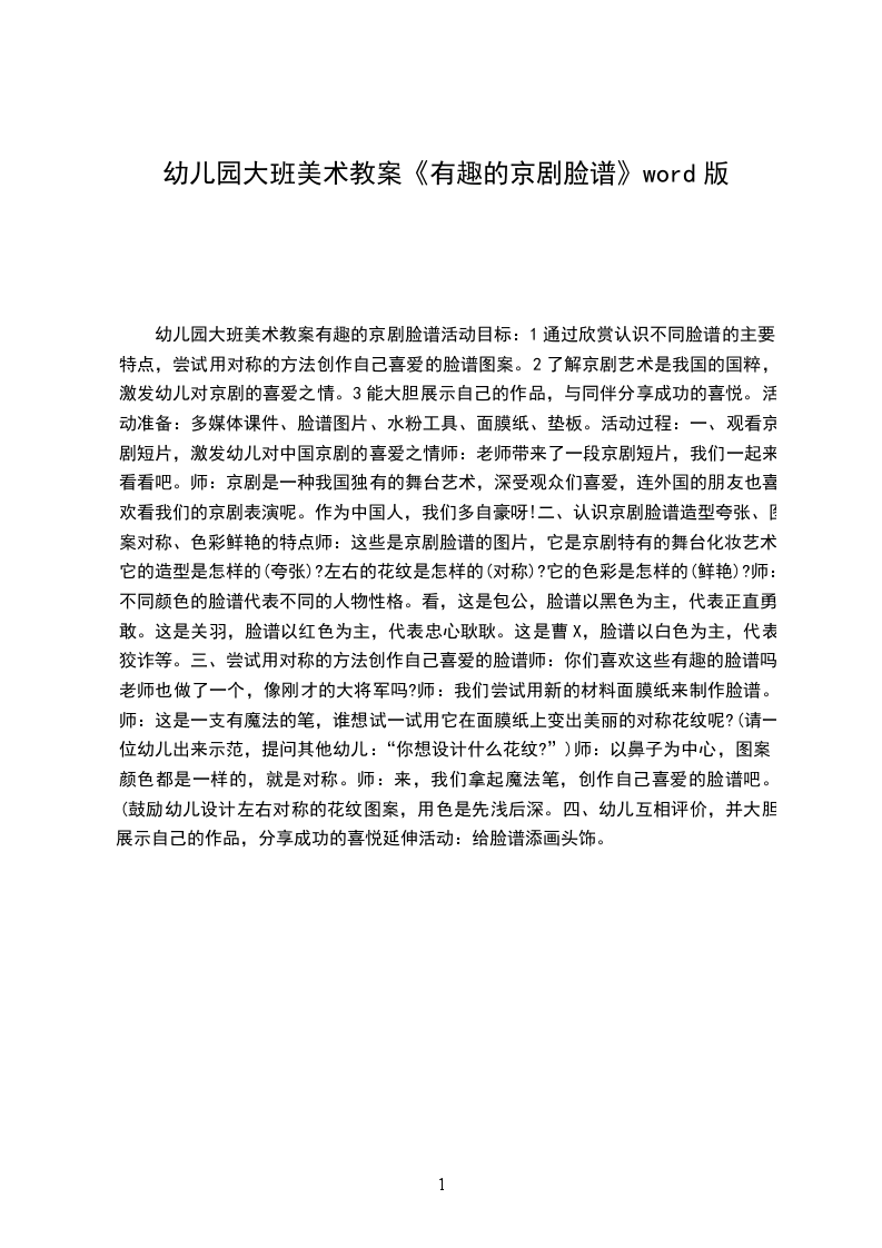 幼儿园大班美术教案有趣的京剧脸谱活动目标:1通过欣赏认识不同脸谱的主要特点,尝试用对称的方法创作自己喜爱的脸谱图案。2了解京剧艺术是我国的国粹,激发幼儿对京剧的喜爱之情。3能大胆展示自己的作品,与同伴分享成功的喜悦。活动准备:多媒体课件、脸谱图片、水粉工具、面膜纸、垫板。