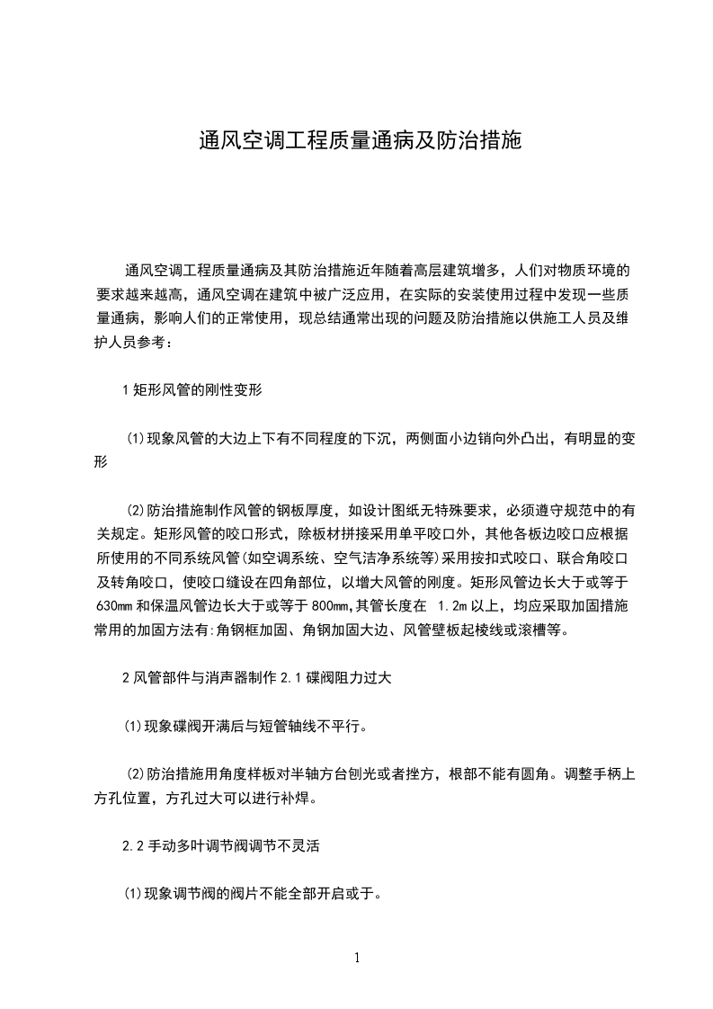 通风空调工程质量通病及其防治措施近年随着高层建筑增多,人们对物质环境的要求越来越高,通风空调在建筑中被广泛应用,在实际的安装使用过程中发现一些质量通病,影响人们的正常使用,现总结通常出现的问题及防治措施以供施工人员及维护人员参考: