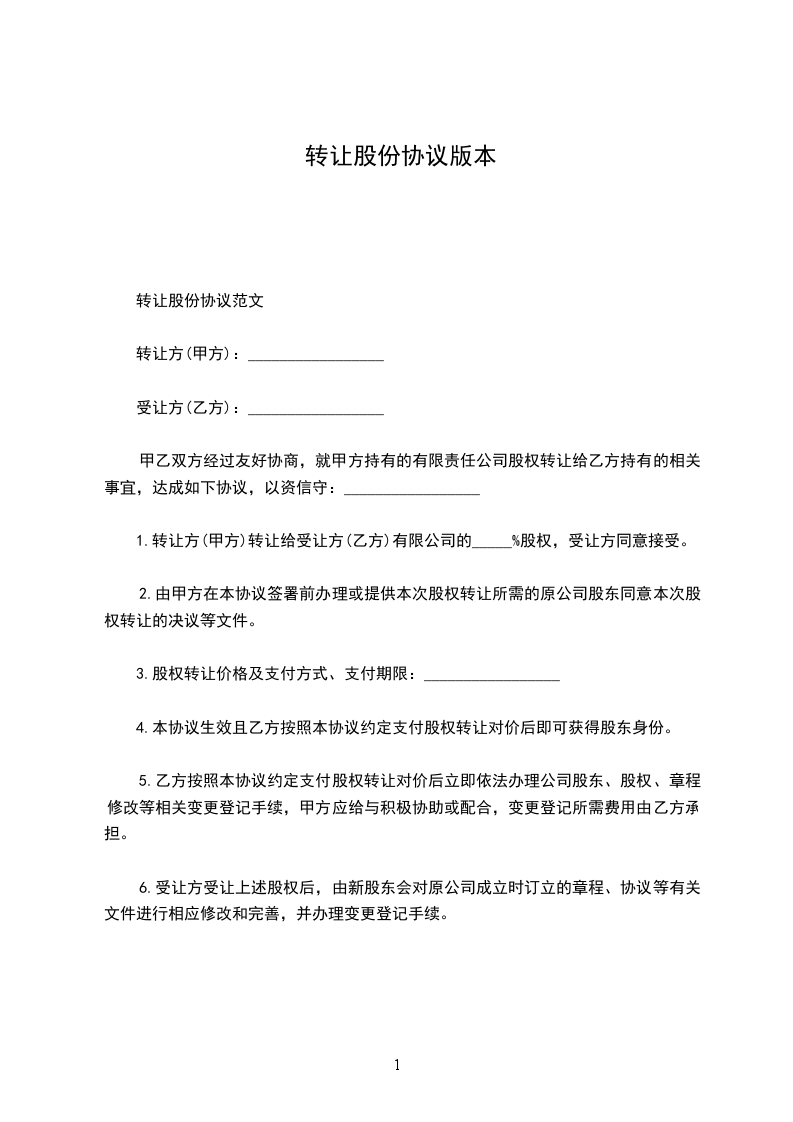 转让股份合同甲方:_乙方:_日期:_转让股份合同转让方:(甲方)住所:受让方:(乙方)住所:本合同由甲方与乙方就的股份转让事宜,在_市订立。甲乙双方本着平等互利的原则,经友好协商,达成如下协议: