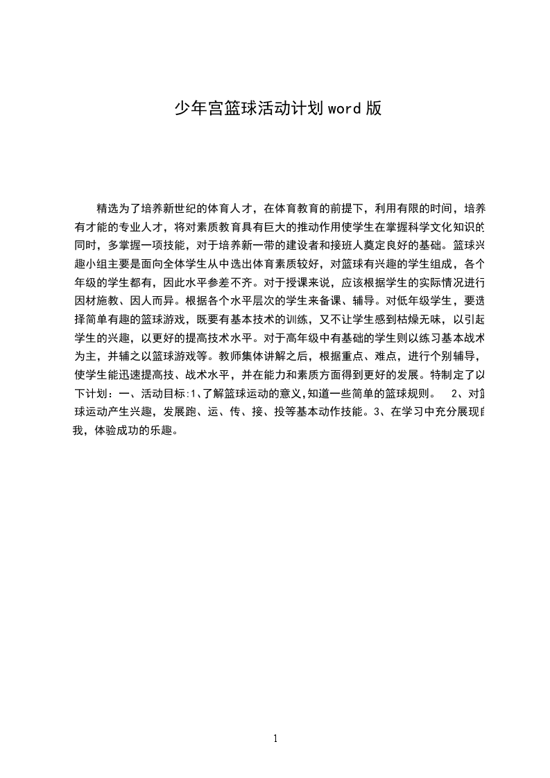 精选为了培养新世纪的体育人才,在体育教育的前提下,利用有限的时间,培养有才能的专业人才,将对素质教育具有巨大的推动作用使学生在掌握科学文化知识的同时,多掌握一项技能,对于培养新一带的建设者和接班人奠定良好的基础。篮球兴趣小组主要是面向全体学生从中选出体育素质较好,对篮球有兴趣的学生组成,各个年级的学生都有,因此水平参差不齐。对于授课来说,应该根据学生的实际情况进行因材施教、因人而异。根据各个水平层次的学生来备课、辅导。对低年级学生,要选择简单有趣的篮球游戏,既要有基本技术的训练,又不让学生感到枯燥无味,以引起学生的兴趣,以更好的提高技术水平。对于高年级中有基础的学生则以练习基本战术为主,并辅之以篮球游戏等。教师集体讲解之后,根据重点、难点,进行个别辅导,使学生能迅速提高技、战术水平,并在能力和素质方面得到更好的发展。特制定了以下计划: