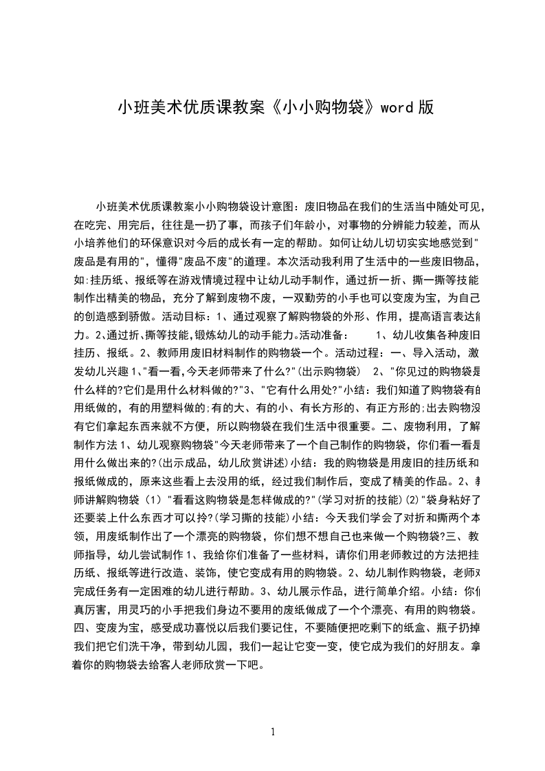 小班美术优质课教案小小购物袋设计意图:废旧物品在我们的生活当中随处可见,在吃完、用完后,往往是一扔了事,而孩子们年龄小,对事物的分辨能力较差,而从小培养他们的环保意识对今后的成长有一定的帮助。如何让幼儿切切实实地感觉到"废品是有用的",懂得"废品不废"的道理。本次活动我利用了生活中的一些废旧物品,如:挂历纸、报纸等在游戏情境过程中让幼儿动手制作,通过折一折、撕一撕等技能制作出精美的物品,充分了解到废物不废,一双勤劳的小手也可以变废为宝,为自己的创造感到骄傲。活动目标: