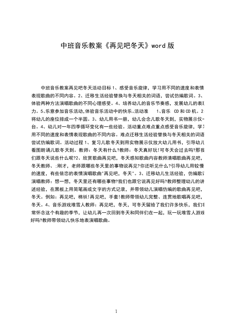 2、欣赏歌曲再见吧,冬天感知歌曲内容教师清唱歌曲再见吧,冬天教师、;刚才,老师跟哪些冬天里的事物说再见?你还听见什么?引导幼儿用较慢的速度,有些依恋的表情演唱歌曲"再见吧,冬天"。