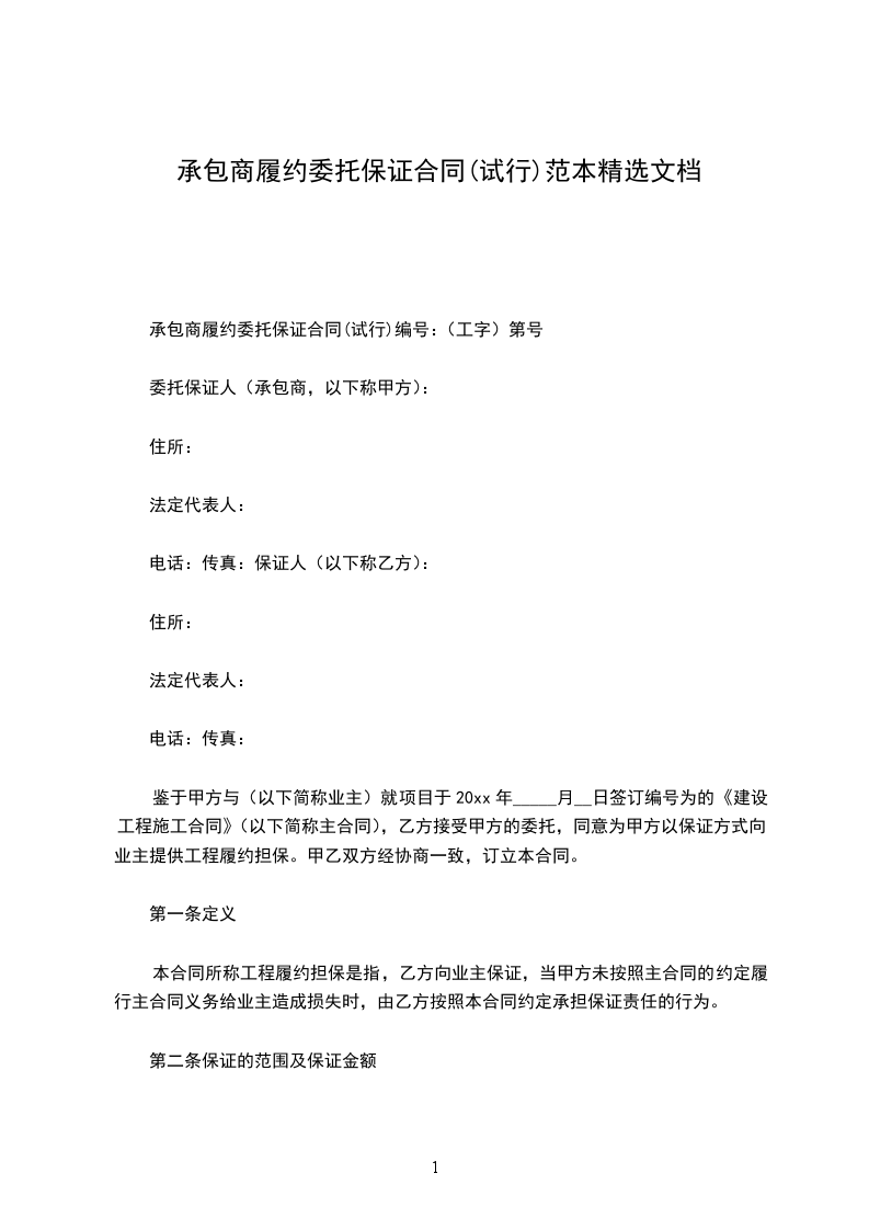 鉴于甲方与(以下简称业主)就项目于20xx年_____月__日签订编号为的《建设工程施工合同》(以下简称主合同),乙方接受甲方的委托,同意为甲方以保证方式向业主提供工程履约担保。甲乙双方经协商一致,订立本合同。