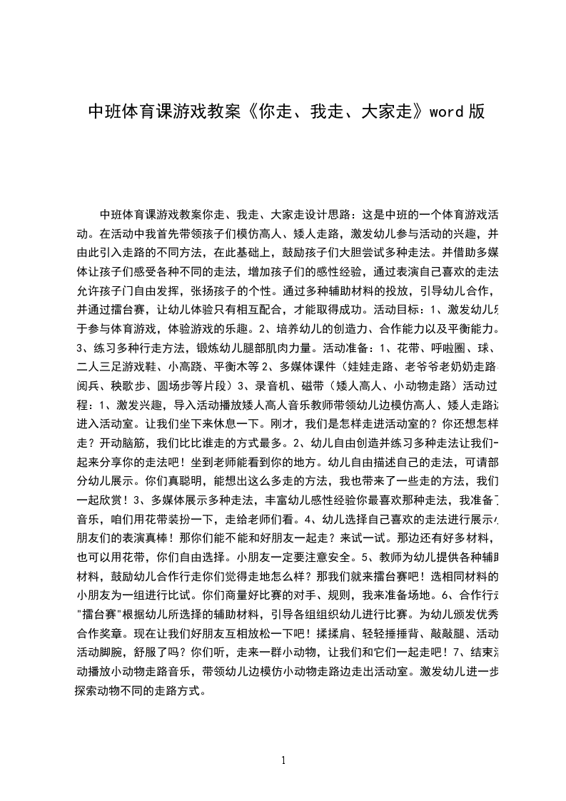 中班体育课游戏教案你走、我走、大家走设计思路:这是中班的一个体育游戏活动。在活动中我首先带领孩子们模仿高人、矮人走路,激发幼儿参与活动的兴趣,并由此引入走路的不同方法,在此基础上,鼓励孩子们大胆尝试多种走法。并借助多媒体让孩子们感受各种不同的走法,增加孩子们的感性经验,通过表演自己喜欢的走法,允许孩子门自由发挥,张扬孩子的个性。通过多种辅助材料的投放,引导幼儿合作,并通过擂台赛,让幼儿体验只有相互配合,才能取得成功。活动目标: