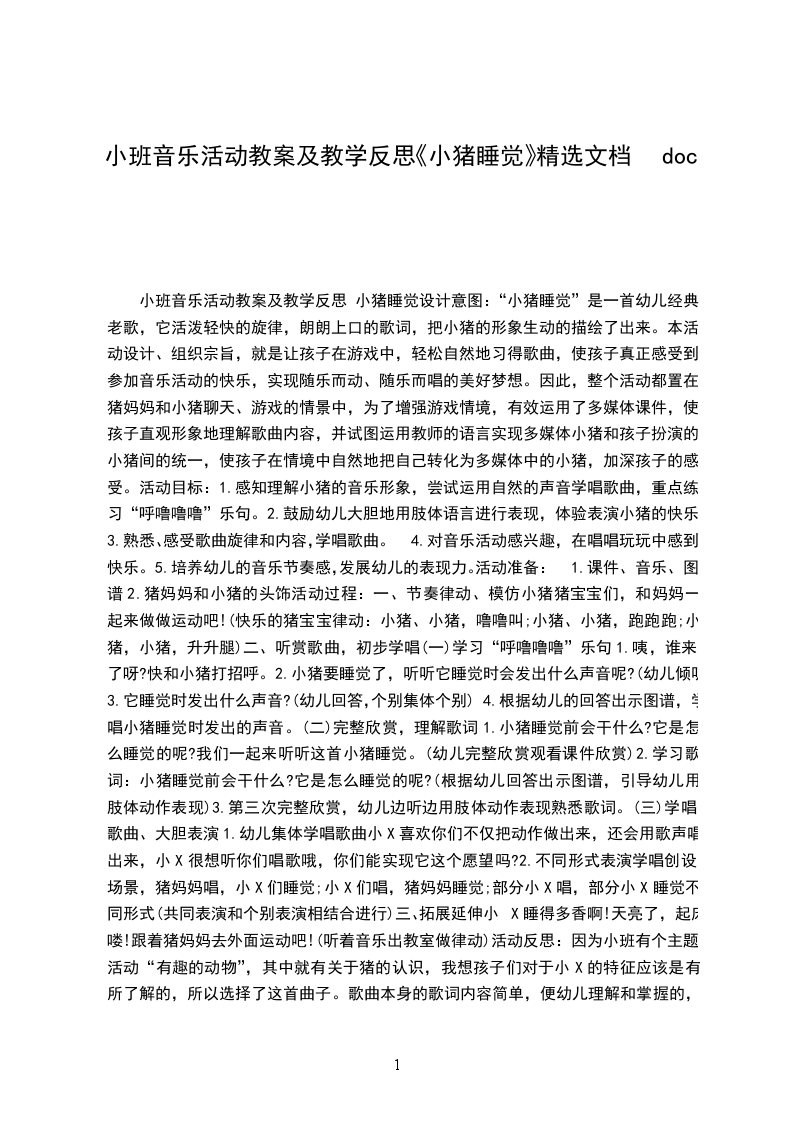 小班音乐活动教案及教学反思 小猪睡觉设计意图:“小猪睡觉”是一首幼儿经典老歌,它活泼轻快的旋律,朗朗上口的歌词,把小猪的形象生动的描绘了出来。本活动设计、组织宗旨,就是让孩子在游戏中,轻松自然地习得歌曲,使孩子真正感受到参加音乐活动的快乐,实现随乐而动、随乐而唱的美好梦想。因此,整个活动都置在猪妈妈和小猪聊天、游戏的情景中,为了增强游戏情境,有效运用了多媒体课件,使孩子直观形象地理解歌曲内容,并试图运用教师的语言实现多媒体小猪和孩子扮演的小猪间的统一,使孩子在情境中自然地把自己转化为多媒体中的小猪,加深孩子的感受。活动目标: