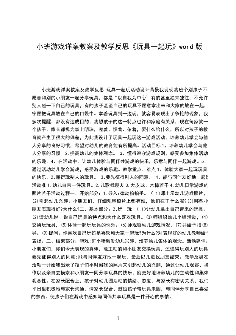 小班游戏详案教案及教学反思 玩具一起玩活动设计背景我发现我班个别孩子不愿意和别的小朋友一起分享玩具,都是“以自我为中心”有的甚至独来独往,不允许别人碰一下自己的玩具,有的孩子甚至自己的玩具不愿意拿出来和大家的放在一起,宁愿把玩具放在自己的口袋中。拿着玩具到一边玩,就容易表现出了争抢的现象,我多次提醒,都没有达成目的,我想孩子的这一特点也许和家庭有关系,现在每家就一个孩子,家长都视为掌上明珠,宠着、惯着、依着,要什么给什么,所以对孩子的教育就产生了很大的偏差,为此我设计了玩具一起玩这一游戏活动,培养幼儿学会与他人分享的良好习惯,希望对幼儿的教育能有所提高。活动目标