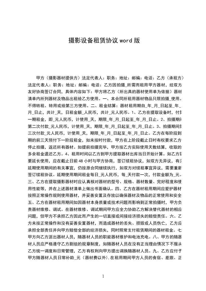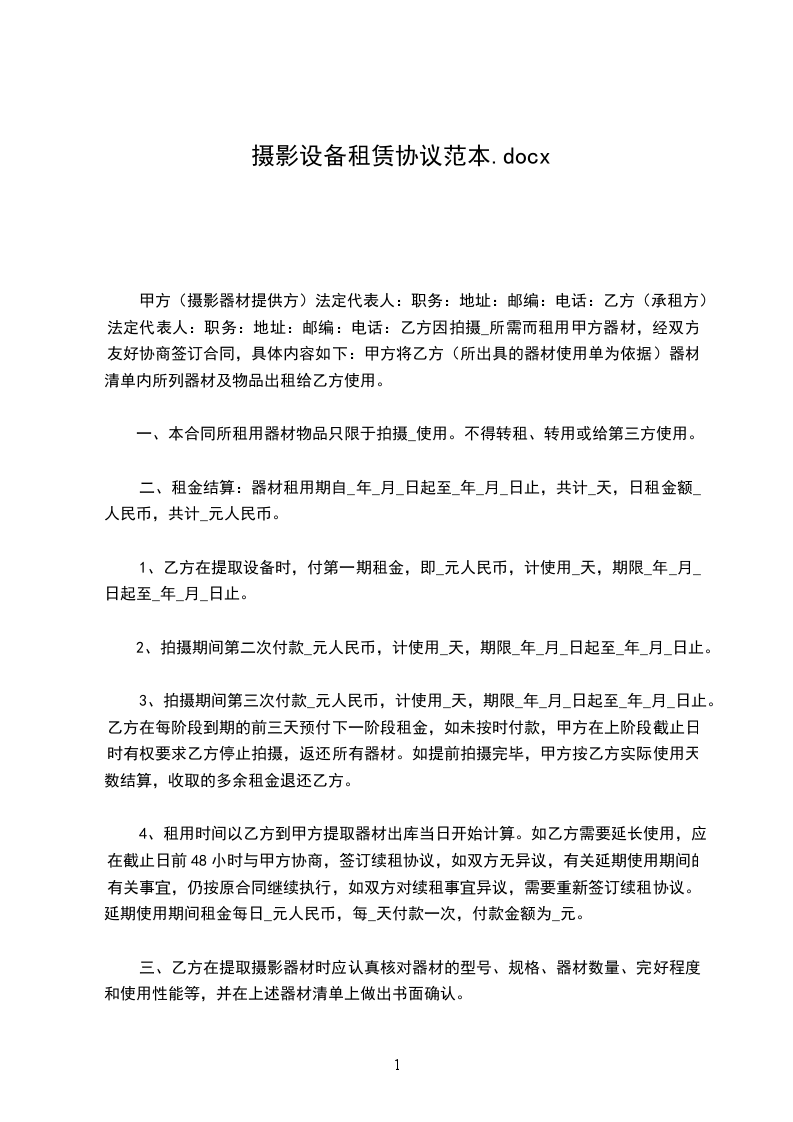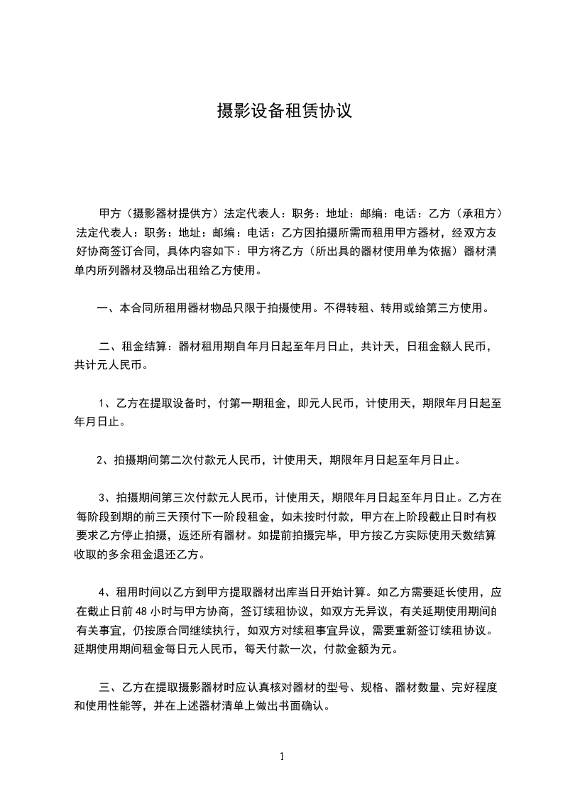 甲方(摄影器材提供方)法定代表人:职务:地址:邮编:电话:乙方(承租方)法定代表人:职务:地址:邮编:电话:乙方因拍摄_所需而租用甲方器材,经双方友好协商签订合同,具体内容如下:甲方将乙方(所出具的器材使用单为依据)器材清单内所列器材及物品出租给乙方使用。
