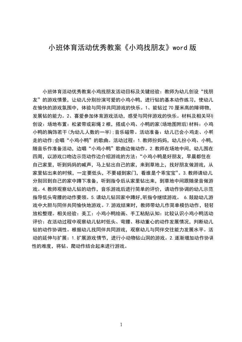 小班体育活动优秀教案小鸡找朋友活动目标及关键经验:教师为幼儿创设“找朋友”的游戏情景,让幼儿分别扮演可爱的小鸡小鸭,进行钻的基本动作练习,使幼儿在愉快的游戏氛围中,体验与同伴共同游戏的快乐。