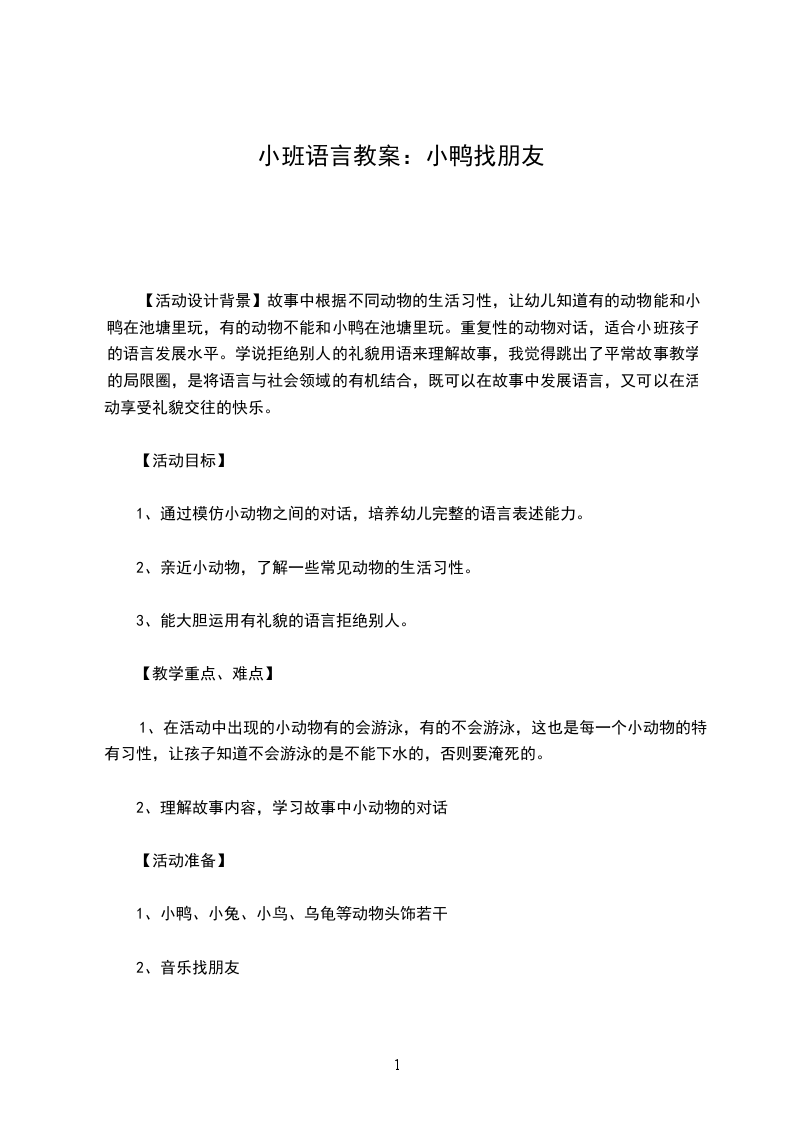 2、喜爱参加体育游戏活动,感受与同伴游戏的快乐。材料及相关环境创设:场地布置:松紧带或彩绳2根,搭成小鸡、小鸭的家(场地图附后)材料:小鸡、小鸭的胸饰若干(为幼儿人数的一半);音乐磁带。活动准备:幼儿已会小鸡走、小鸭走的动作;会唱“小鸡小鸭”的歌曲。