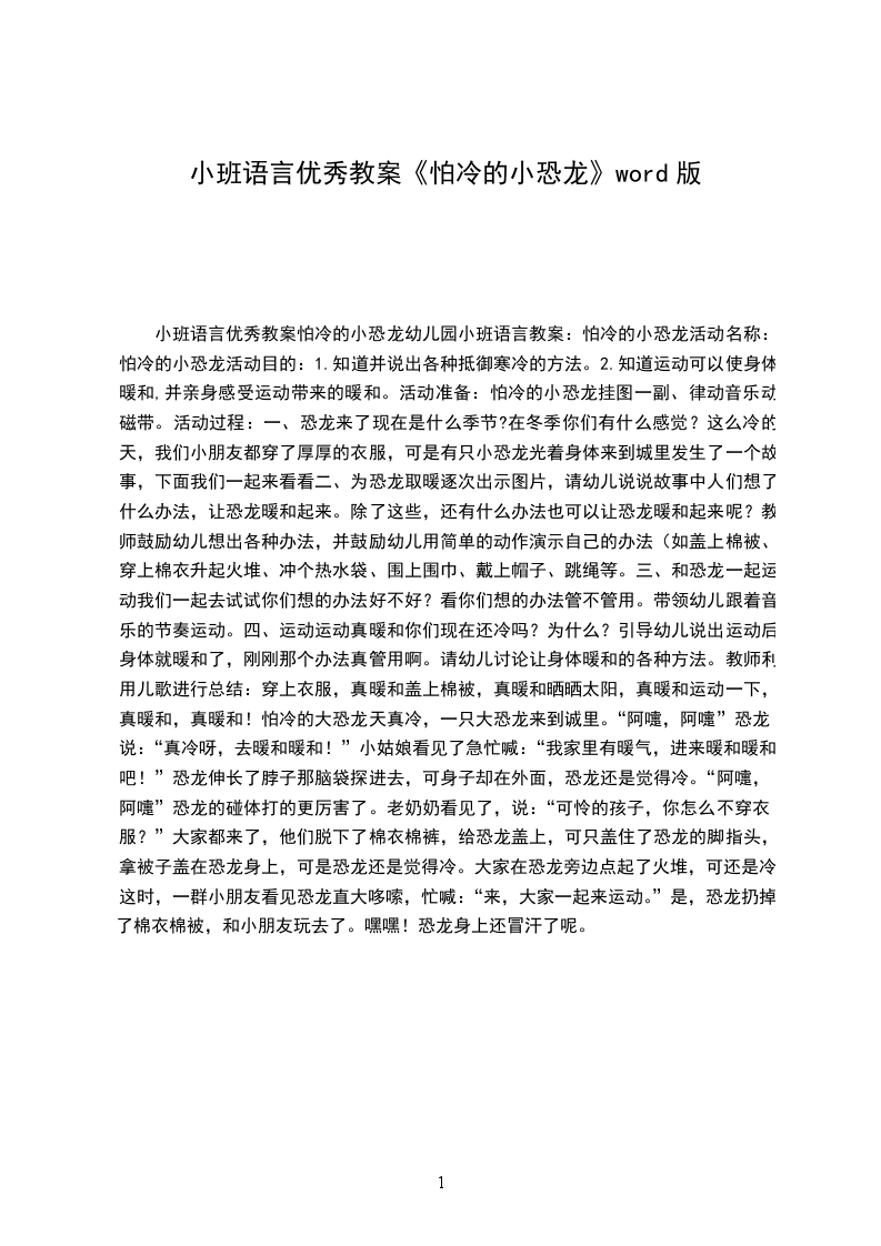 小班语言优秀教案怕冷的小恐龙幼儿园小班语言教案:怕冷的小恐龙活动名称:怕冷的小恐龙活动目的: