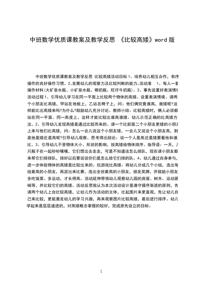 4、幼儿通过自身参与,进一步体验物体的高矮是比较出来的。玩游戏比高矮:将幼儿分成几个小组,选出每组最高的小朋友,再派出来比赛,选出全班最高的小朋友,颁发奖牌,并鼓励小朋友,多吃饭菜、多运动,才长得高。活动延伸带领幼儿观察幼儿园的房屋、树木、运动器械等,并比较它们的高矮。活动反思我认为本次活动设计是遵守循序渐进的原则,先请两个幼儿上台比较高矮,让幼儿作为活动的主体,比起图片来更直观,先让幼儿自己来比较,更能激发幼儿的学习兴趣,再来观察图片比较高矮,最后进行排序。幼儿学起来是层层递进的,对高矮概念掌握的较好,完成原先设立的目标。