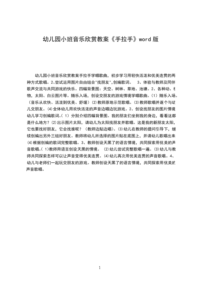 幼儿园小班音乐欣赏教案手拉手学唱歌曲,初步学习用轻快活泼和优美连贯的两种方式歌唱。