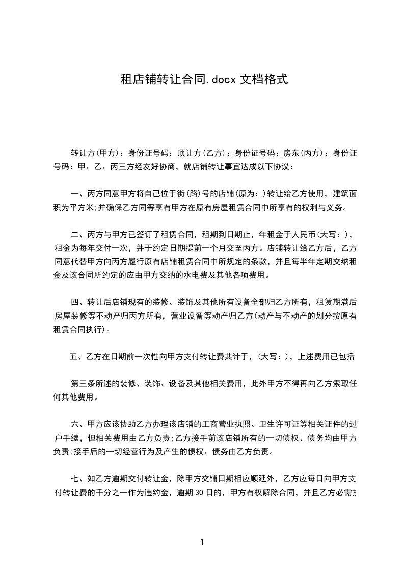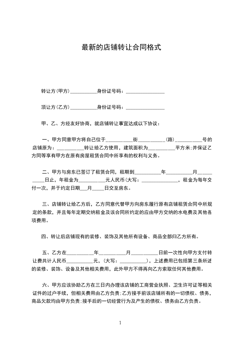 一、甲方同意甲方将自己位于___________街___________(路)___________号的店铺原为:___________转让给乙方使用,建筑面积为___________平方米;并保证乙方同等享有甲方在原有房屋租赁合同中所享有的权利与义务。