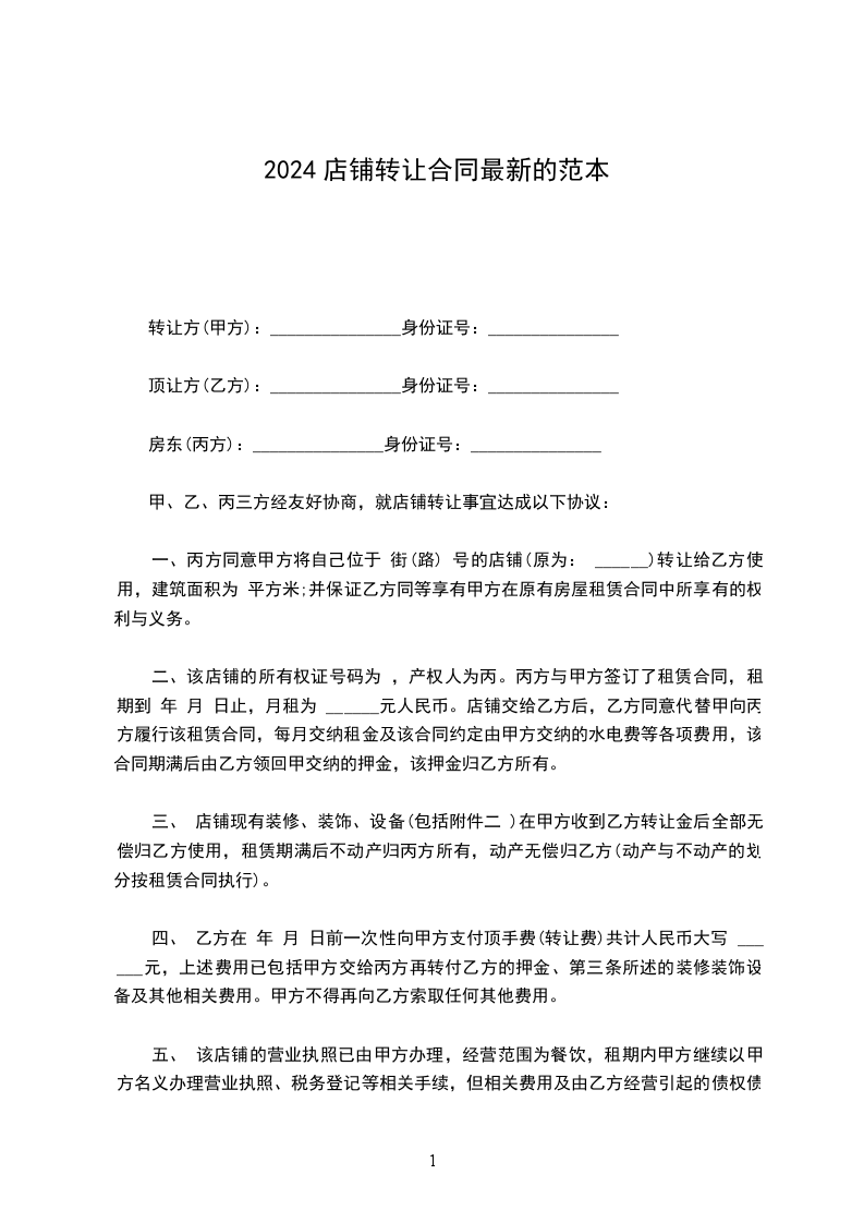 五、乙方在___________年___________月___________日前一次性向甲方支付转让费共计人民币___________元,(大写:___________),上述费用已包括第三条所述的装修、装饰、设备及其他相关费用,此外甲方不得再向乙方索取任何其他费用。