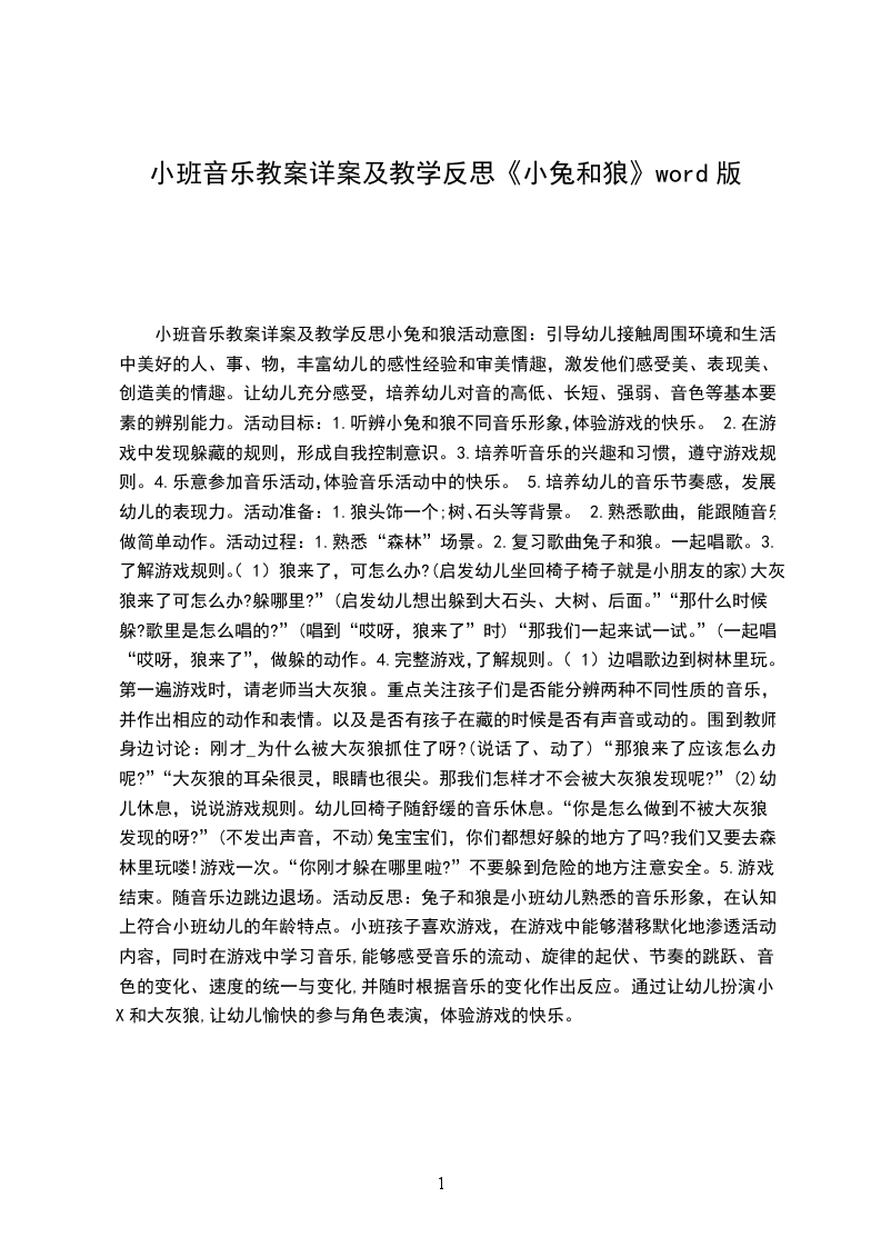 5.游戏结束。随音乐边跳边退场。活动反思:兔子和狼是小班幼儿熟悉的音乐形象,在认知上符合小班幼儿的年龄特点。小班孩子喜欢游戏,在游戏中能够潜移默化地渗透活动内容,同时在游戏中学习音乐,能够感受音乐的流动、旋律的起伏、节奏的跳跃、音色的变化、速度的统一与变化,并随时根据音乐的变化作出反应。通过让幼儿扮演小X和大灰狼,让幼儿愉快的参与角色表演,体验游戏的快乐。