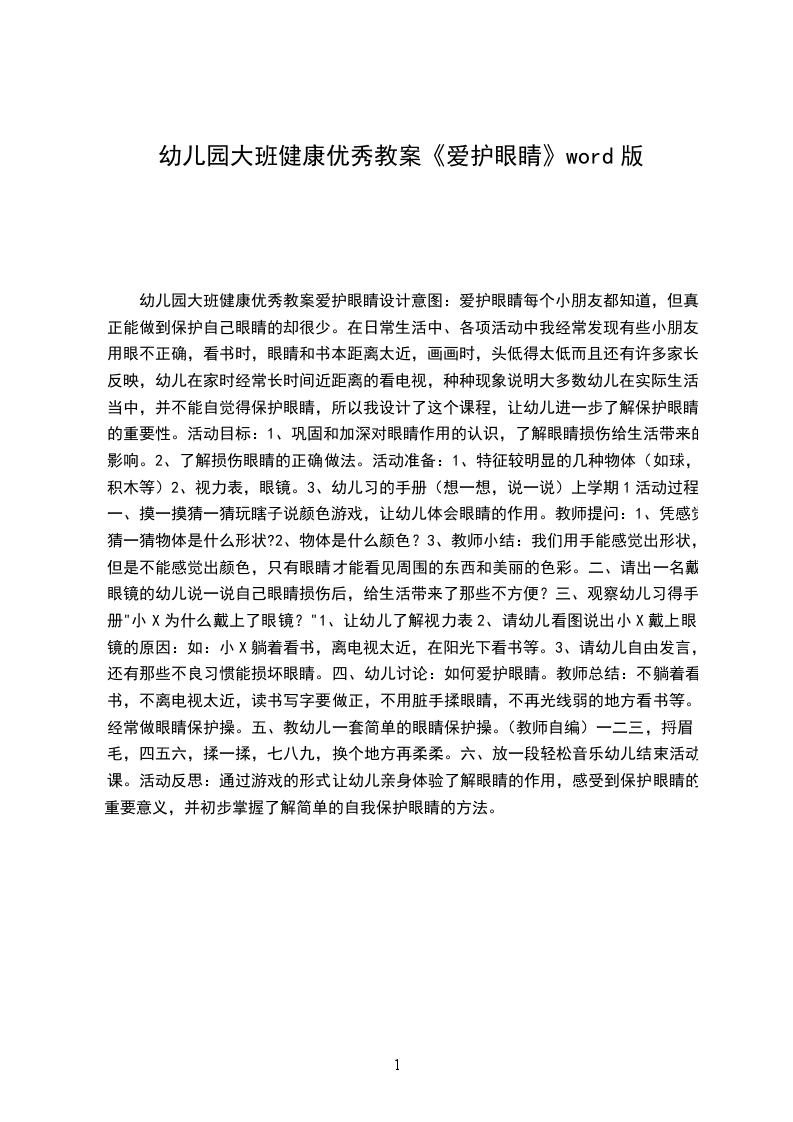 幼儿园大班健康优秀教案爱护眼睛设计意图:爱护眼睛每个小朋友都知道,但真正能做到保护自己眼睛的却很少。在日常生活中、各项活动中我经常发现有些小朋友用眼不正确,看书时,眼睛和书本距离太近,画画时,头低得太低而且还有许多家长反映,幼儿在家时经常长时间近距离的看电视,种种现象说明大多数幼儿在实际生活当中,并不能自觉得保护眼睛,所以我设计了这个课程,让幼儿进一步了解保护眼睛的重要性。活动目标: