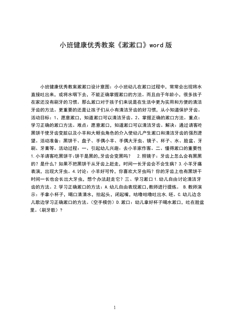小班健康优秀教案漱漱口设计意图:小小班幼儿在漱口过程中,常常会出现将水直接吐出来,或将水咽下去,不能正确掌握漱口的方法。而且由于年龄小,很多孩子在家还没有刷牙的习惯。那么漱口对于孩子们来说是在生活中更为实用和方便的清洁牙齿的方法。更重要的还是让孩子们从小有清洁牙齿的好习惯,从小知道保护牙齿。活动目标: