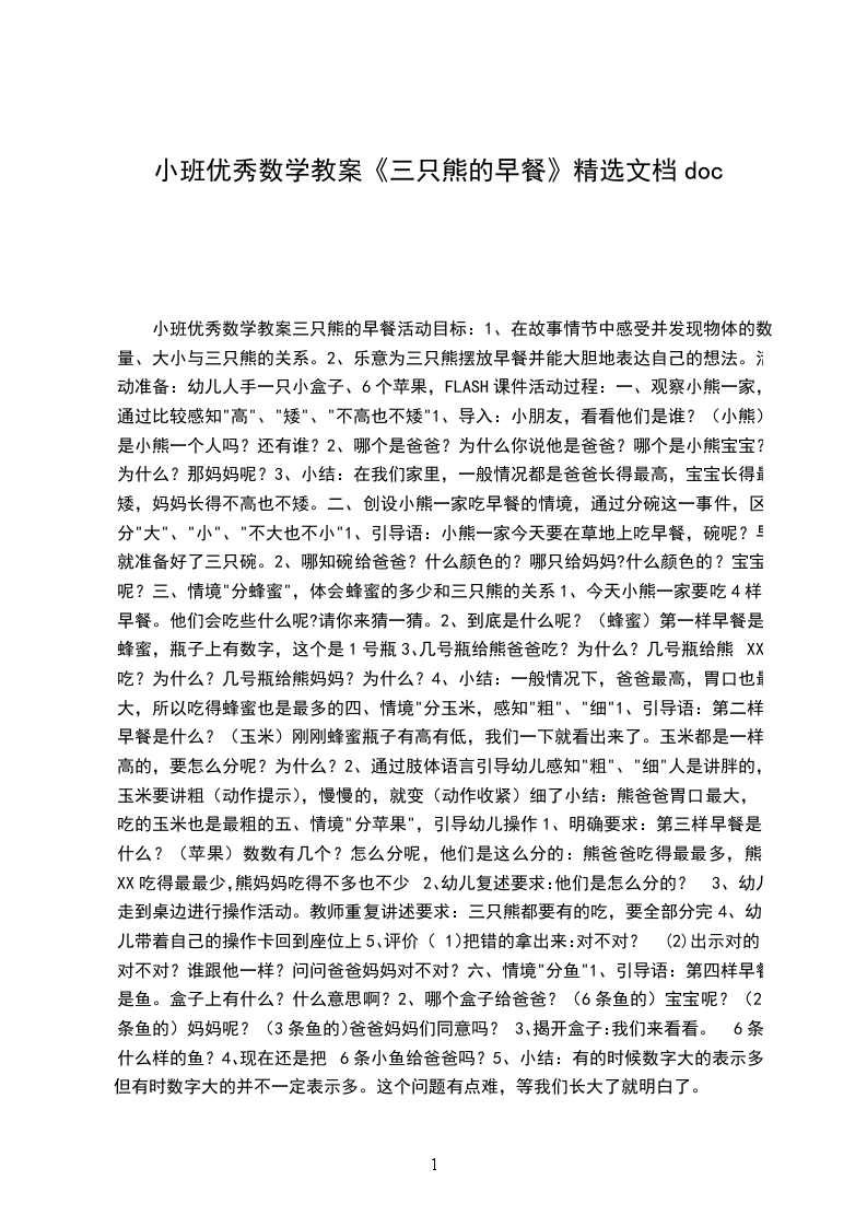 小班优秀数学教案三只熊的早餐活动目标: